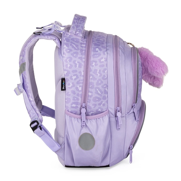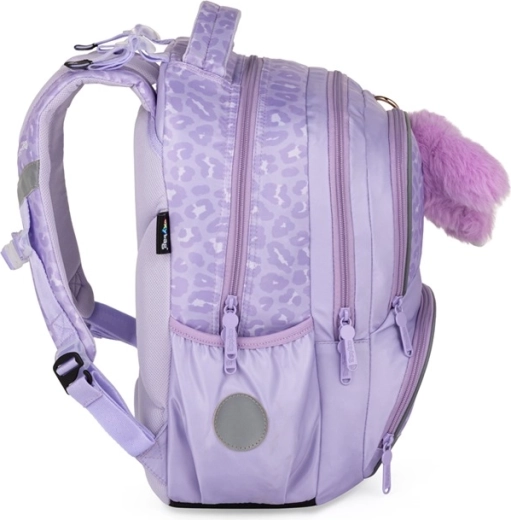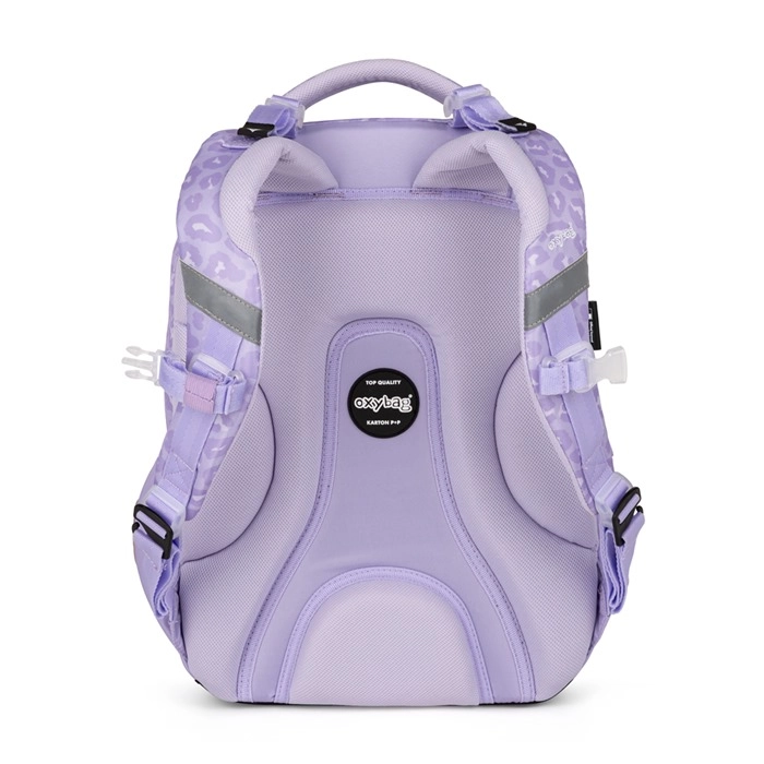 Praktičen tridelni šolski set OXY NEXT Bunny v nežni sivkino barvi združuje prostoren nahrbtnik, veliko peresnico in lahko vrečko za športno opremo. Nahrbtnik ima anatomsko oblikovan hrbtni del, oblazinjene naramnice in prsni pašček za udobno in zdravo nošenje. Ponuja veliko žepov in organizator, stranska žepa za steklenico, držalo za ključe/čip ter odsevne elemente za varnost. Ojačano vodoodporno dno ščiti vsebino tudi v neugodnem vremenu.
