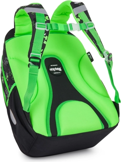 Za varnost skrbi veliko število odsevnih elementov, medtem ko ojačano nepremočljivo dno ščiti vsebino tudi v slabšem vremenu. Del seta je etui JUMBO za pregledno shranjevanje pisal in lahka športna/trening vreča z zatezanjem. Dizajn s piksel/geometrijskim vzorcem v zeleno‑črni kombinaciji je stilski in brezčasen.