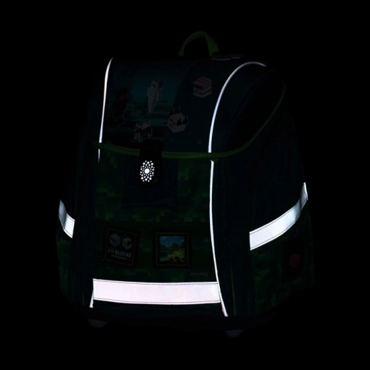 Praktična oprema vključuje preprosto magnetno zapiranje, notranji razdelilnik za pregledno shranjevanje učbenikov in zvezkov, stranske in sprednje žepe ter odsevne elemente za boljšo vidnost. Del kompleta sta vrečka za šport/obutev z zateznimi vrvicami in enoslojna peresnica z dvema preklopoma, elastikami za pripomočke in prozorno folijo za urnik.