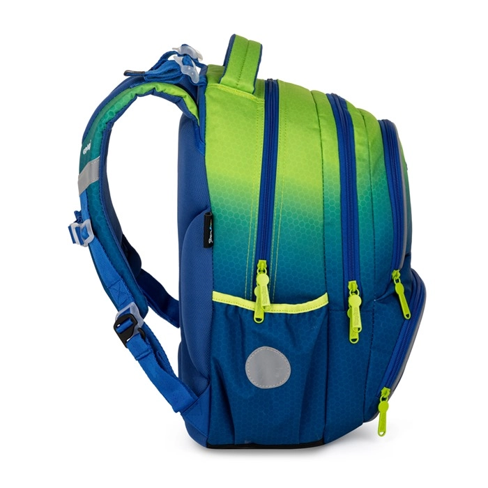 Šolski set OXY NEXT Ombre Green je zasnovan za otroke z višino od 128 cm. Glavna zvezda je lahek šolski nahrbtnik z volumnom 21 l in nosilnostjo 8 kg, ki zaradi anatomsko oblikovanega hrbta ter oblazinjenih, nastavljivih naramnic s prsnim trakom nudi udobje in zdravo porazdelitev bremena. Odsevni elementi povečajo vidnost v mraku in dežju, medtem ko ojačano nepremočljivo dno ščiti vsebino pred vlago.