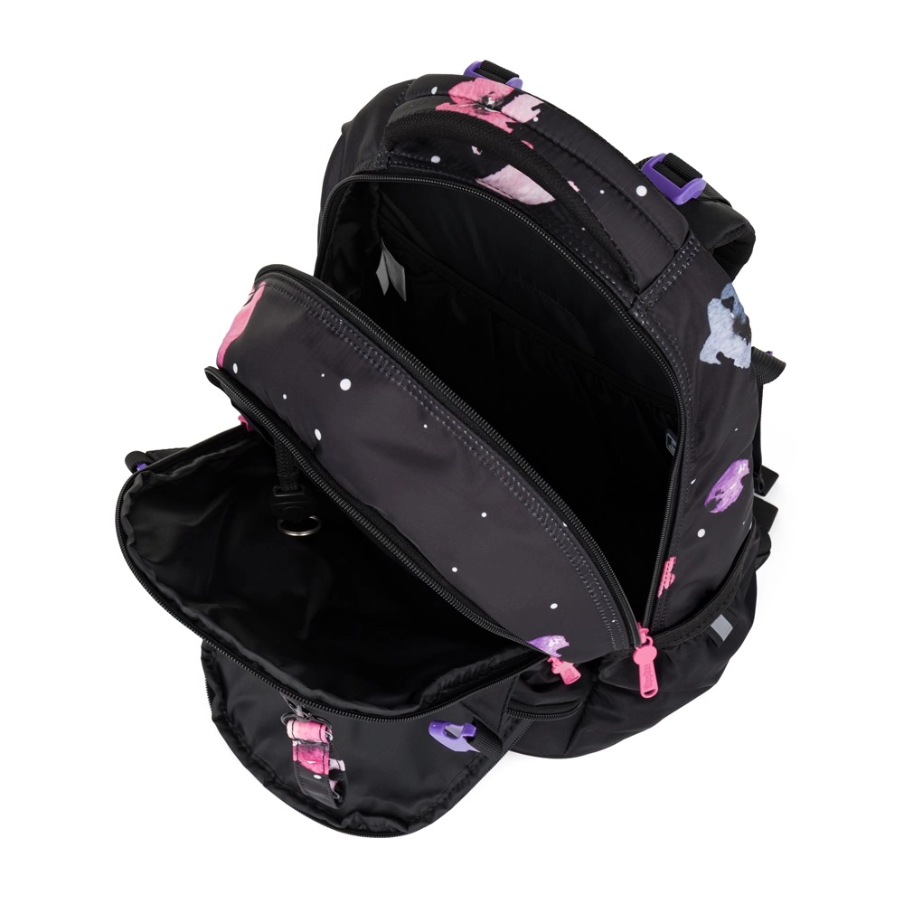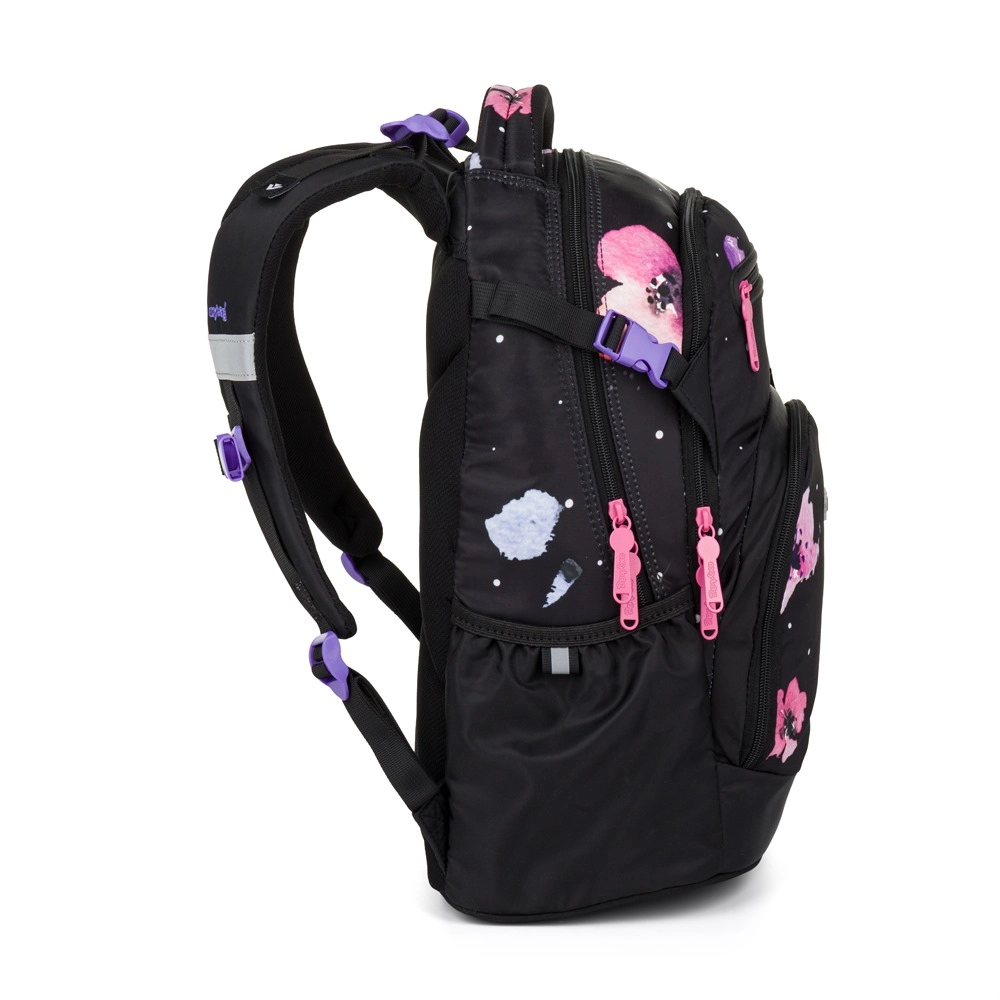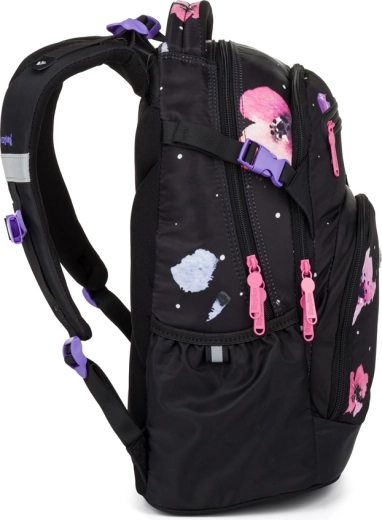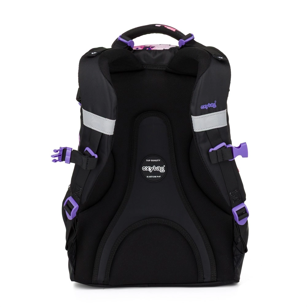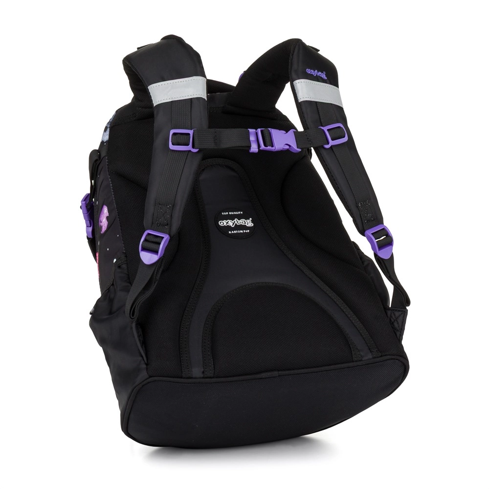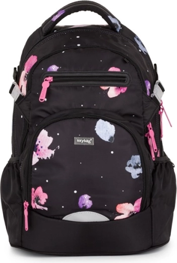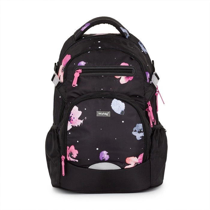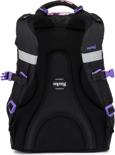 Šolski nahrbtnik OXY Ombre Flowers je zasnovan za udobno vsakodnevno nošenje od 3. razreda dalje. Zahvaljujoč ergonomskemu hrbtnemu panelu (dolžina 43 cm) in mehko podloženim naramnicam se odlično prilagodi otroškemu hrbtu. Nastavljiv prsni trak drži naramnice na mestu, medtem ko čvrsto, stabilno dno preprečuje prevrnitev in ščiti vsebino.
