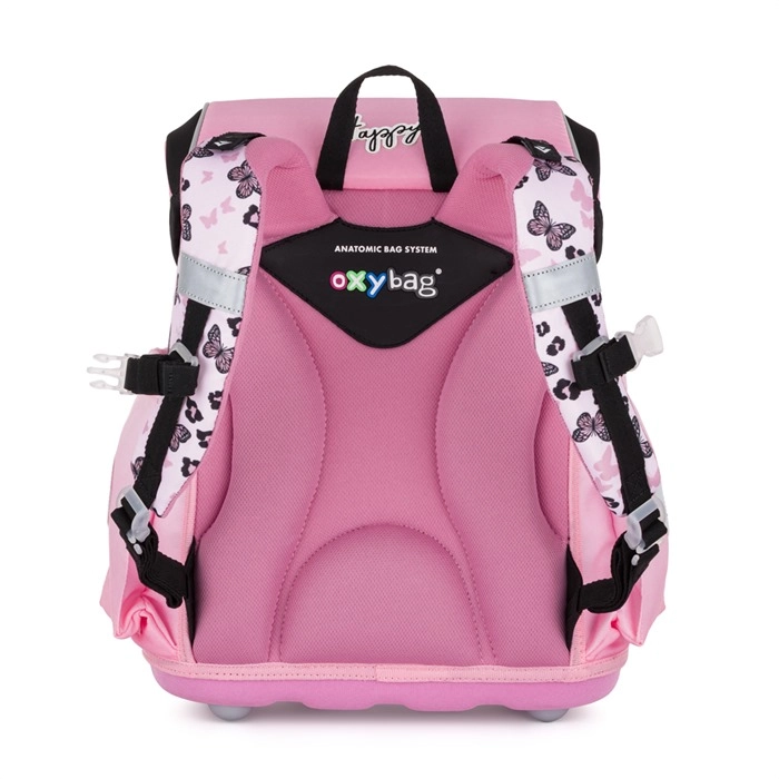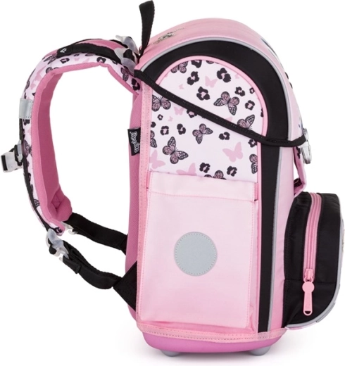 Ta rožnata šolska aktovka PREMIUM Panda je zasnovana za pravilno držo telesa mlajših šolarjev. Anatomsko oblikovano hrbtišče z notranjo ojačitvijo ohranja stalno obliko, medtem ko zračna oblazinitev in široke podložene naramnice porazdelijo težo enakomerno in udobno. S pomočjo dodatnih kaveljčkov je mogoče naramnice bolje prilagoditi in zagotoviti stabilen položaj na hrbtu.