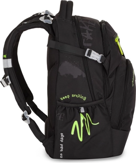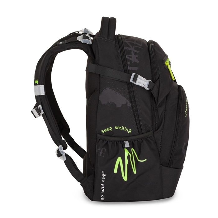 Dva prostorna prekata sprejmeta učbenike in zvezke, sprednji žep je idealen za malico, stranska elastična žepa pa udobno držita plastenko s pijačo.