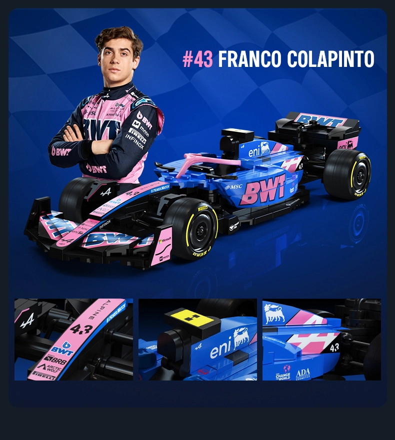 Sestavite ikonični enosedežnik BWT ALPINE F1 A525 v merilu 1:24 iz 300 kosov. Podroben model z realističnimi elementi, kot so sistem Halo, ogledala in volan, ima funkcionalna kolesa za gladko gibanje. Odlično darilo za ljubitelje F1 in navdušence nad konstruktorji.