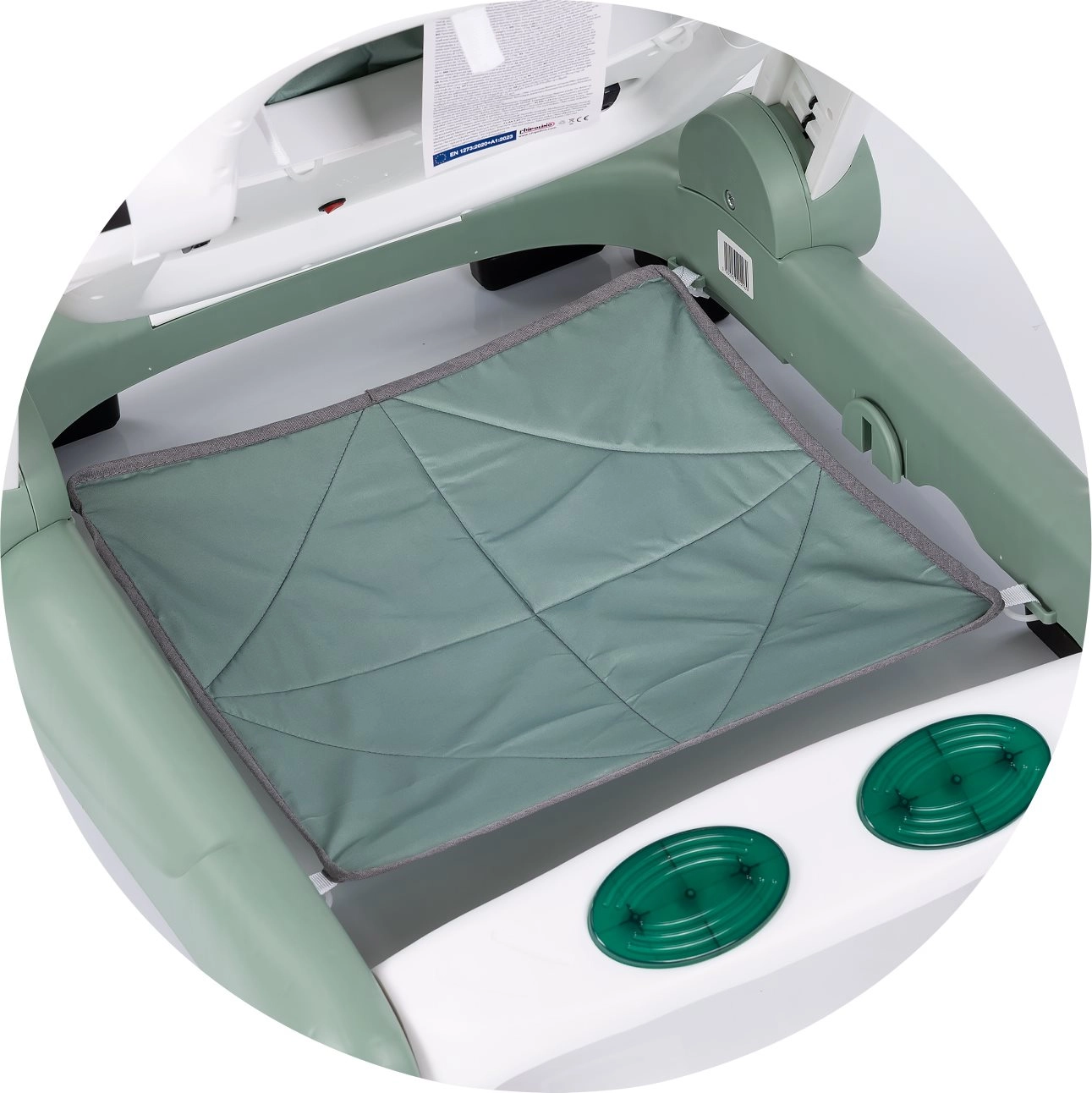Protizdrsne podloge, zagozde, zaklepljiva kolesa in možnost regulacije hitrosti dopolnjujejo mehko oblazinjeni sedež in stabilen okvir.