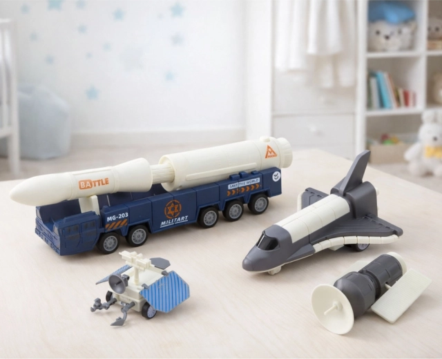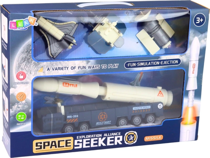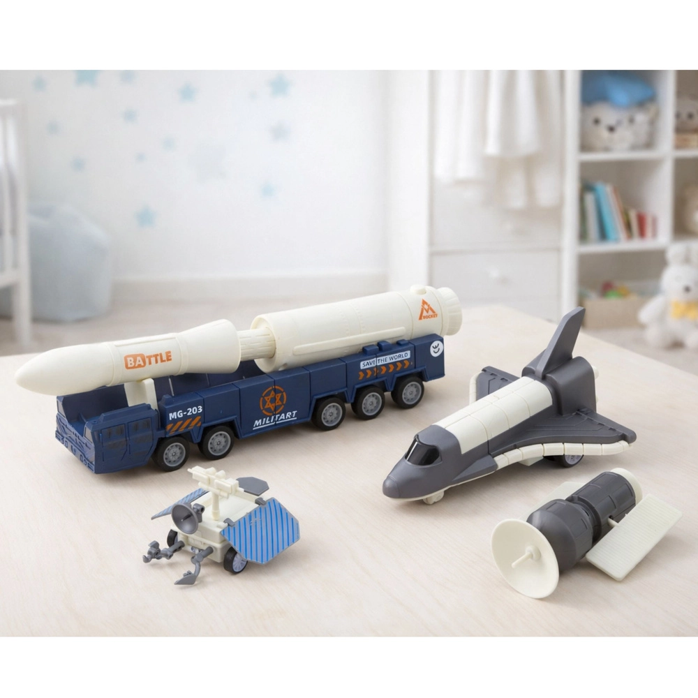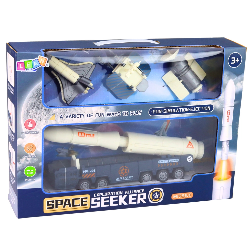 Ta dodelan kozmični set omogoča otrokom ustvarjati lastne scenarije izstrelitev, orbitalnih misij in zemeljskih priprav. S kombinacijo rakete na posebnem večosnem podvozju, raketoplana in satelita lahko mali raziskovalci simulirajo celoten potek vesoljske odprave – od prevoza na rampo do namestitve satelita na tirnici.