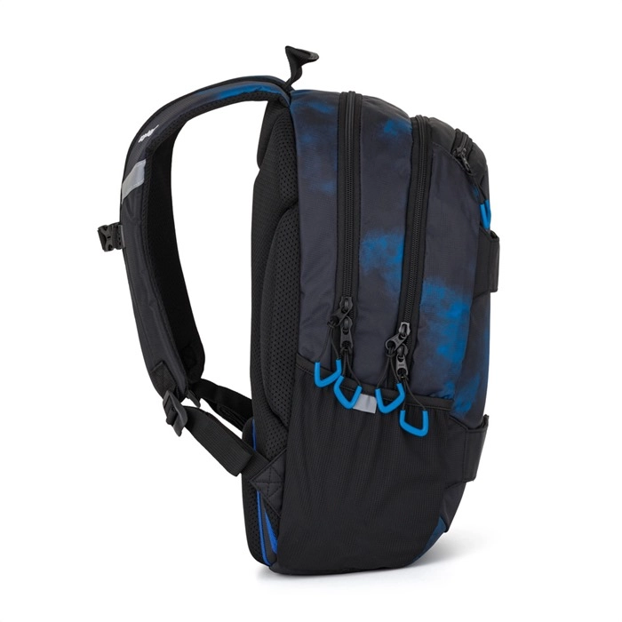 Notranjost je pametno zasnovana: dva glavna predelka za knjige in fascikle, ojačan žep varno zaščiti prenosnik, manjši žep in karabin ohranjata red pri drobnarijah. Praktičen skriti žep na hrbtni strani varno spravi dragocenosti, stranski žep pa je pripravljen za steklenico. Odsevni elementi povečujejo vidnost na poti v šolo in domov.