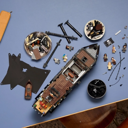 Uživajte v interaktivnih elementih: vrtite upravne zobnike za izvlek topov na levem in desnem boku, upravljajte krmilo, odprite palubo in raziščite kapitanovo kabino. Trup je mogoče razdeliti na vodni črti za dinamično predstavitev »v načinu plovbe«. Del kompleta je 8 minifiguric: Jack Sparrow, Will Turner, Gibbs, Cotton, Anamaria, Marty, Elizabeth Swann in Hector Barbossa.