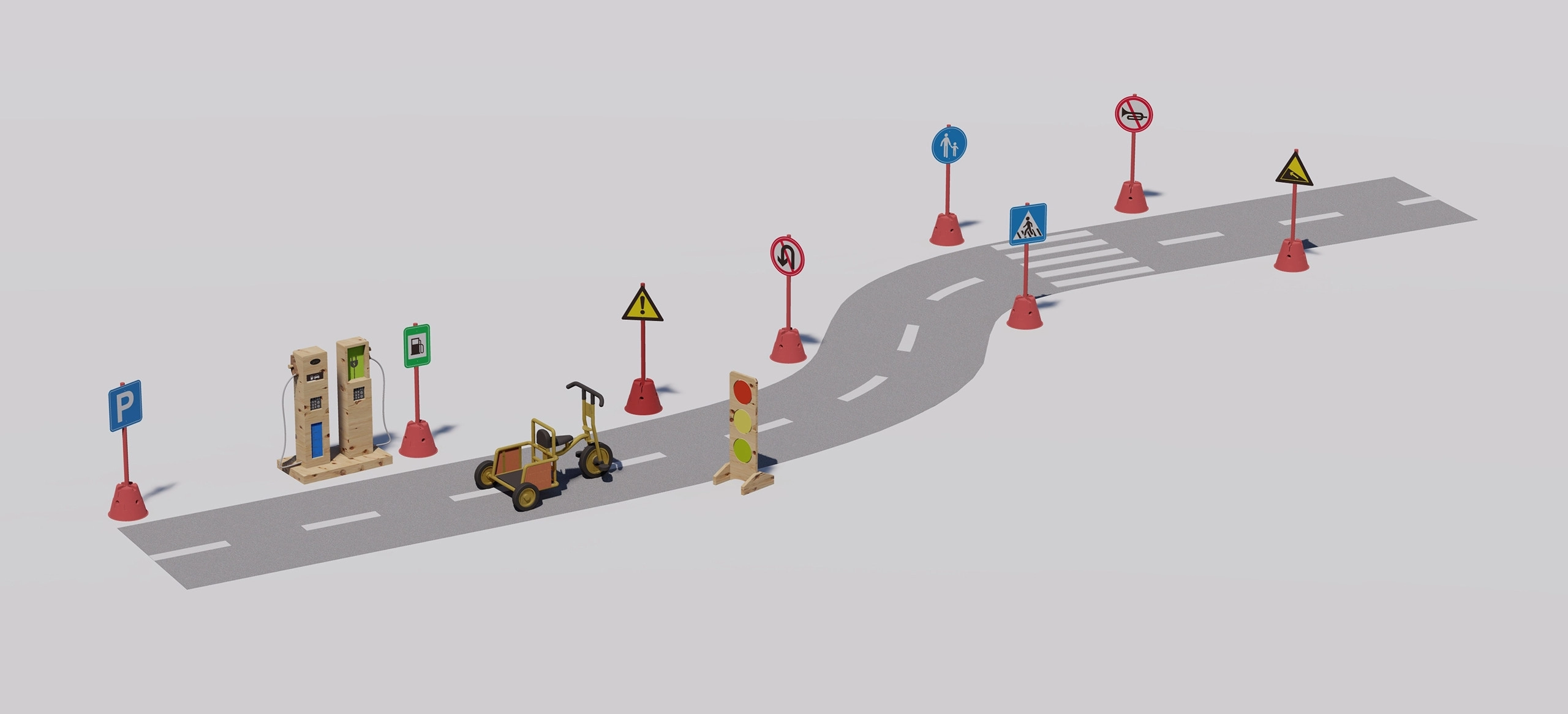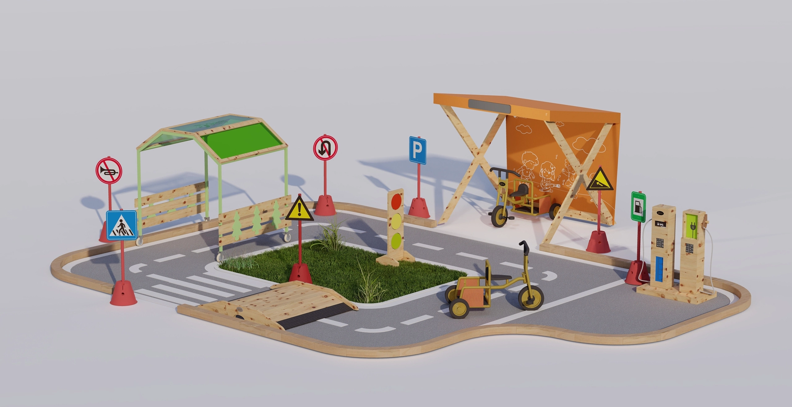 Vzdržljiva lesena konstrukcija je primerna tudi za zunaj, gladke površine in stabilno podnožje pa zagotavljajo varno uporabo. Igra naravno razvija kreativnost, koordinacijske sposobnosti, ročne spretnosti in ekološko ozaveščenost o sodobni mobilnosti.