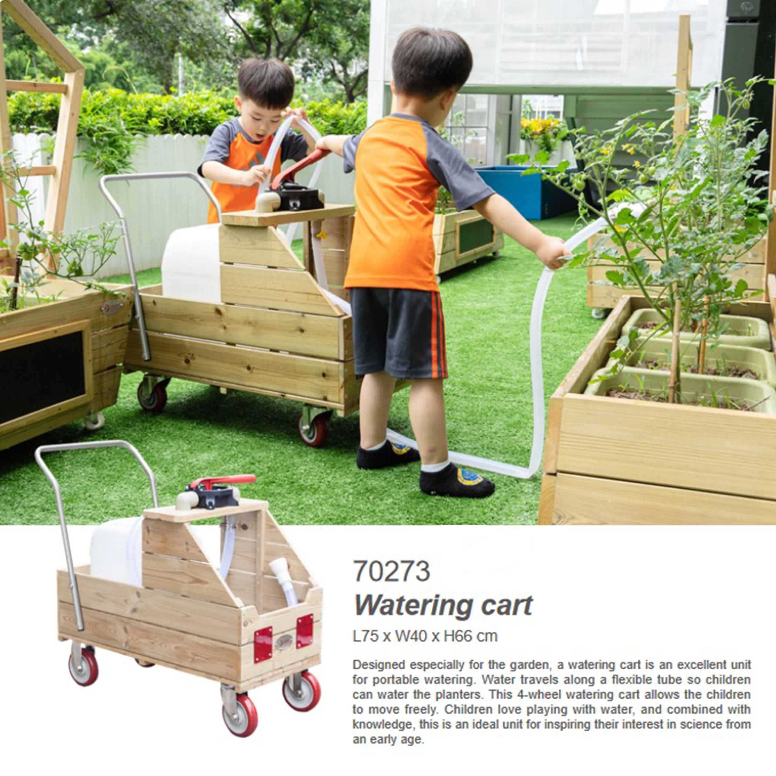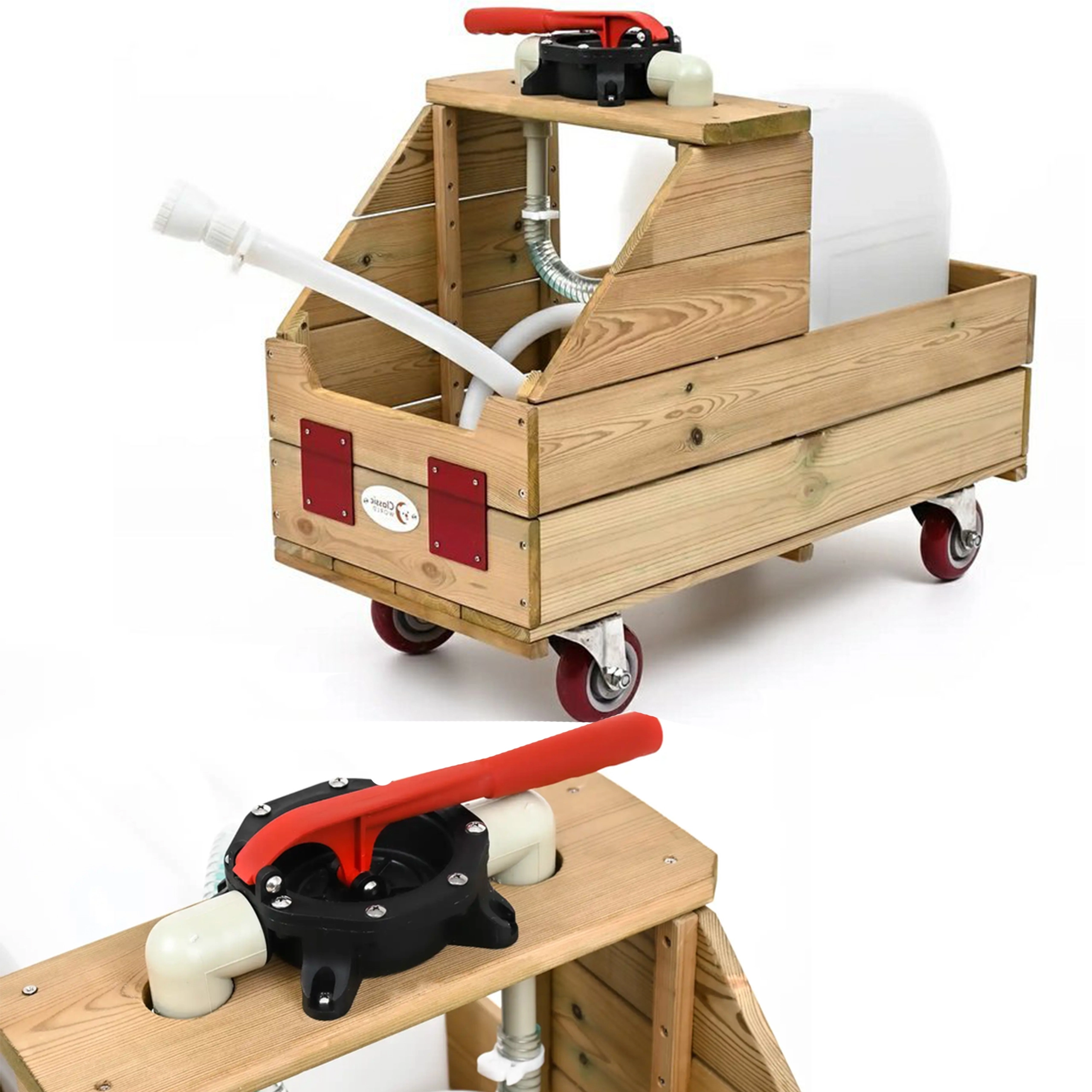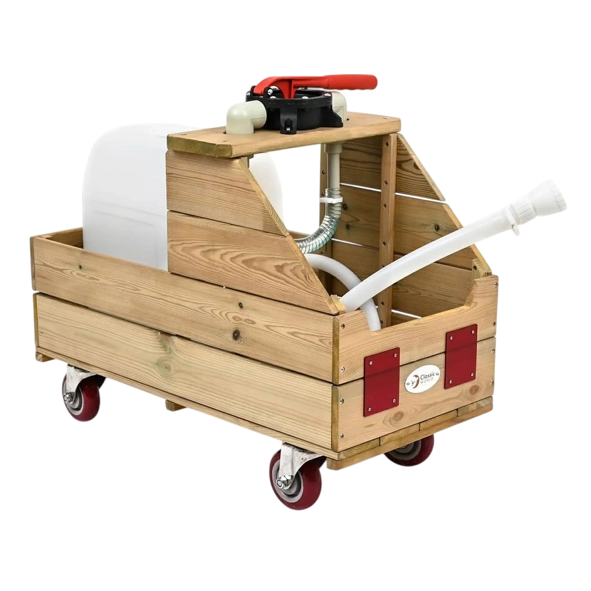 Ta kakovosten leseni voziček je zasnovan za varno in preprosto prenašanje vode neposredno do rastlin. Vgrajena ročna črpalka in prožna cev omogočata otrokom udobno in natančno zalivanje gredic in korit. Stabilen okvir, gladek tek in praktična višina ročaja podpirajo naravno in zdravo gibanje.