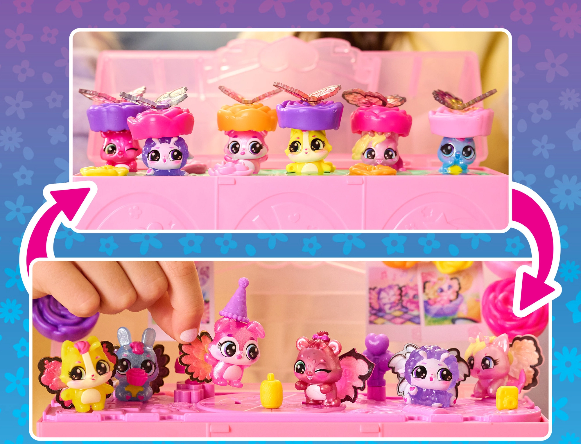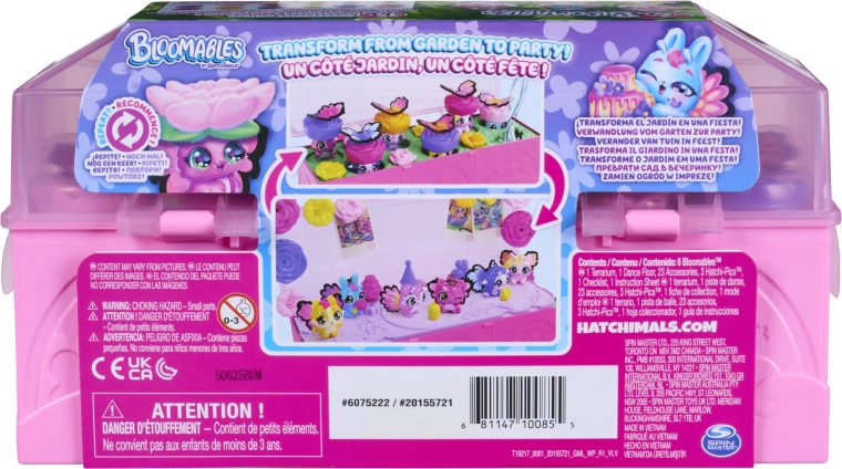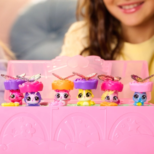 Vstopite v svet domišljije z zbirateljskim kompletom Hatchimals Bloomables Bloom Bash. Dovolj je, da v srce igralnega kovčka vlijete vodo in cvetovi bodo začeli »rasti«, da razkrijejo skrite like – od morske samoroginje do zajčka in kužka. Po razkritju kovček spremenite v plesni podij, figuricam pripnite barvna krilca in pokrov okrasite s fotografijami Hatchi‑Pics.