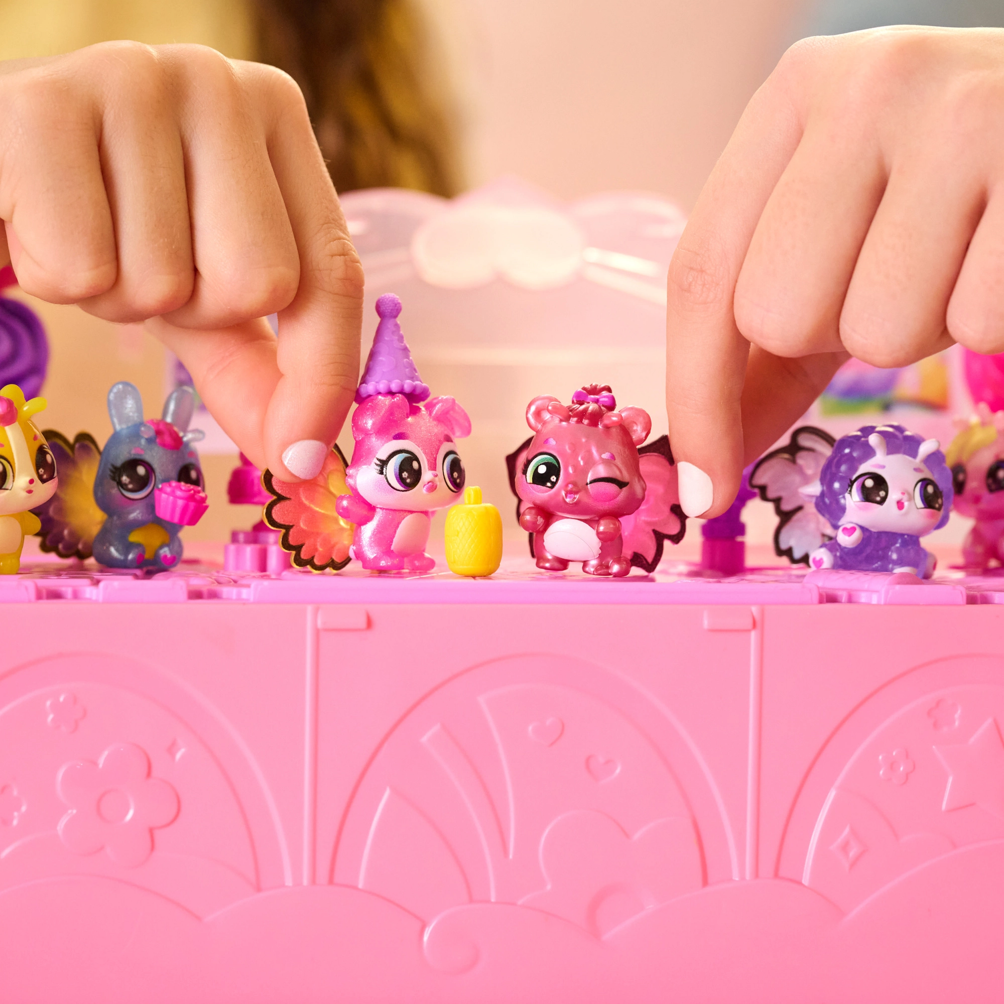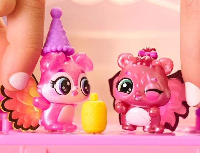Po razkritju set spremenite v plesni podij, figuricam pripnite barvna krilca in pokrov okrasite s fotografijami Hatchi‑Pics. Zabava se začne!