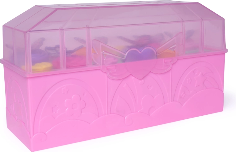 Rožnat kovček s prozornim pokrovom sprejme figurice, cvetove in dodatke. Služi kot prenosna shramba in kot stilska vitrina za zbirko.