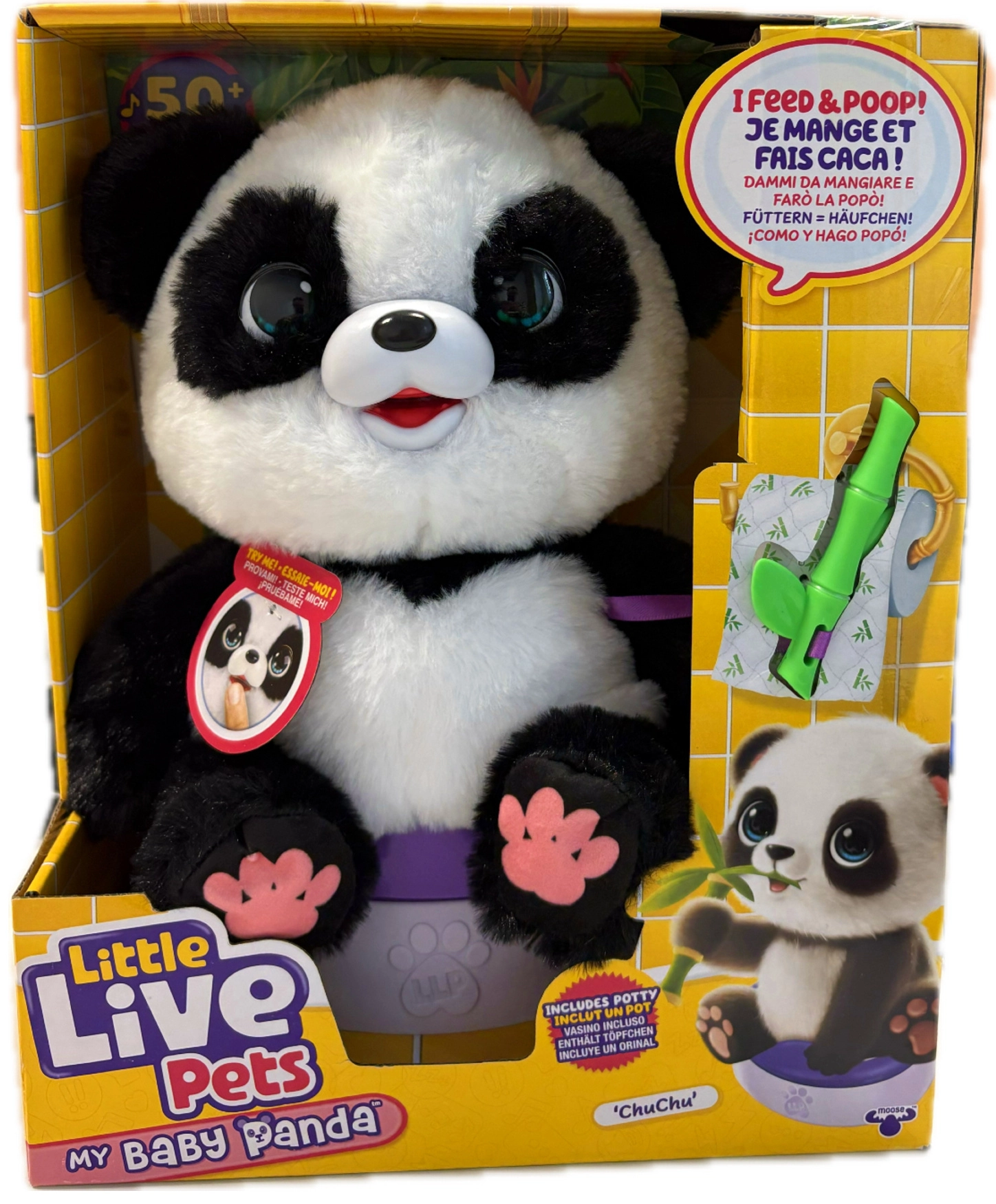 Prisrčna interaktivna panda ChuChu znamke LITTLE LIVE PETS otrokom prinaša realistično skrb za ljubljenčka – odziva se na dotik, predvaja več kot 50 zvokov in reakcij, zna se hraniti z bambusom in na nočniku pokaže zabavni »potty dance«. Mehki pliš je idealen za crkljanje in igro vlog.