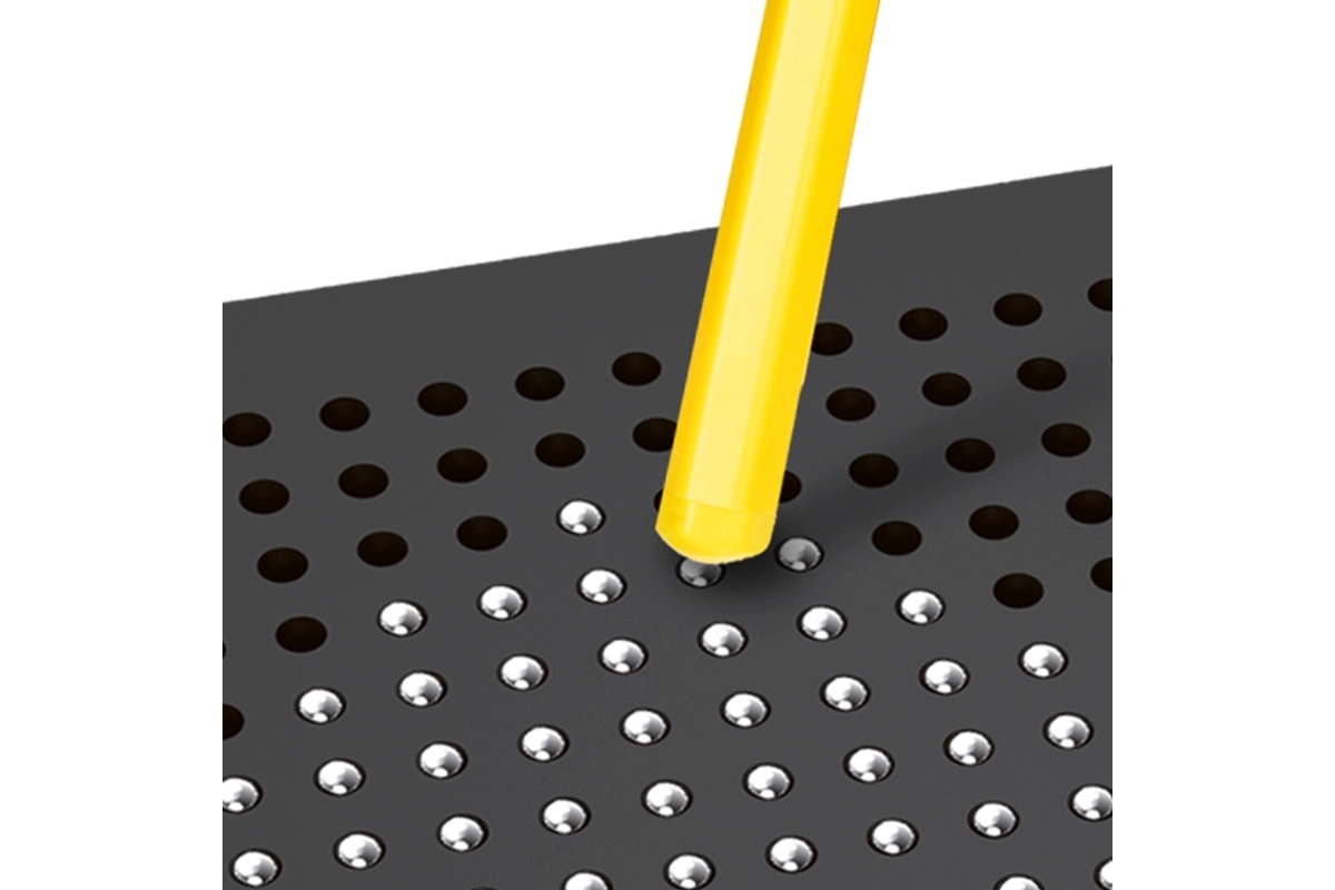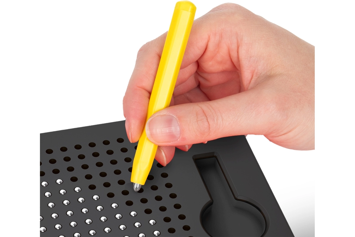 Magnetno pero izvleče kroglice na površino tablice, zato otroci ustvarjajo čisto in znova ter znova – brez papirja, barv in madežev.