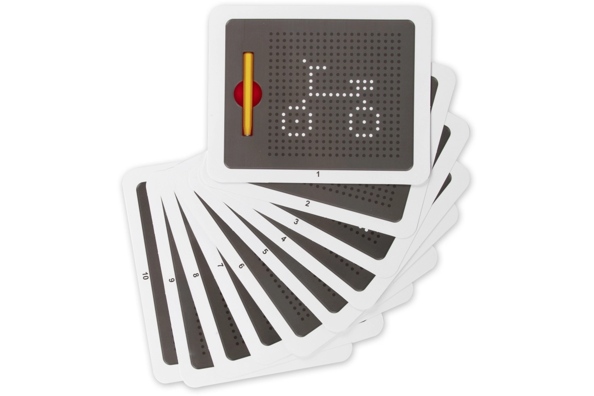 Priložen je komplet 20 kartic z motivi za lahek začetek. Otroci lahko obrisujejo oblike in se učijo korak za korakom.