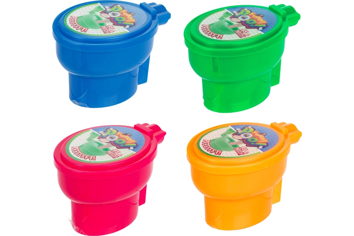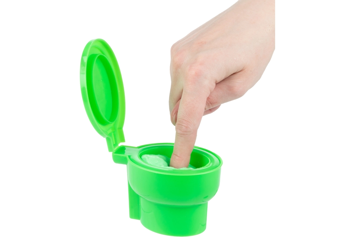 Praktična plastična posodica v obliki stranišča z dvižnim pokrovčkom ohranja sluz svež in pripravljen za nadaljnjo igro doma ali na poti.