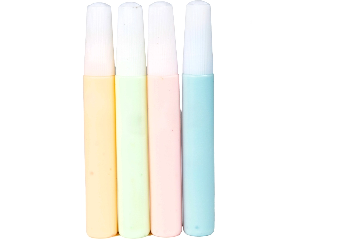 Set vsebuje rumeno, svetlo zeleno, rožnato in svetlo modro za pisane in kreativne kombinacije na tekstilu.