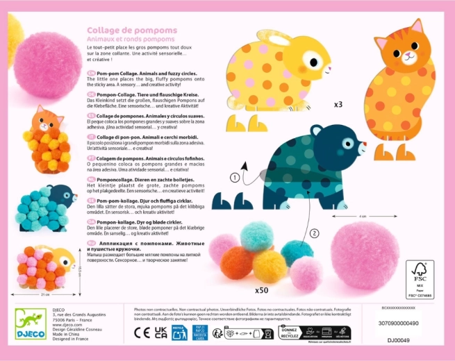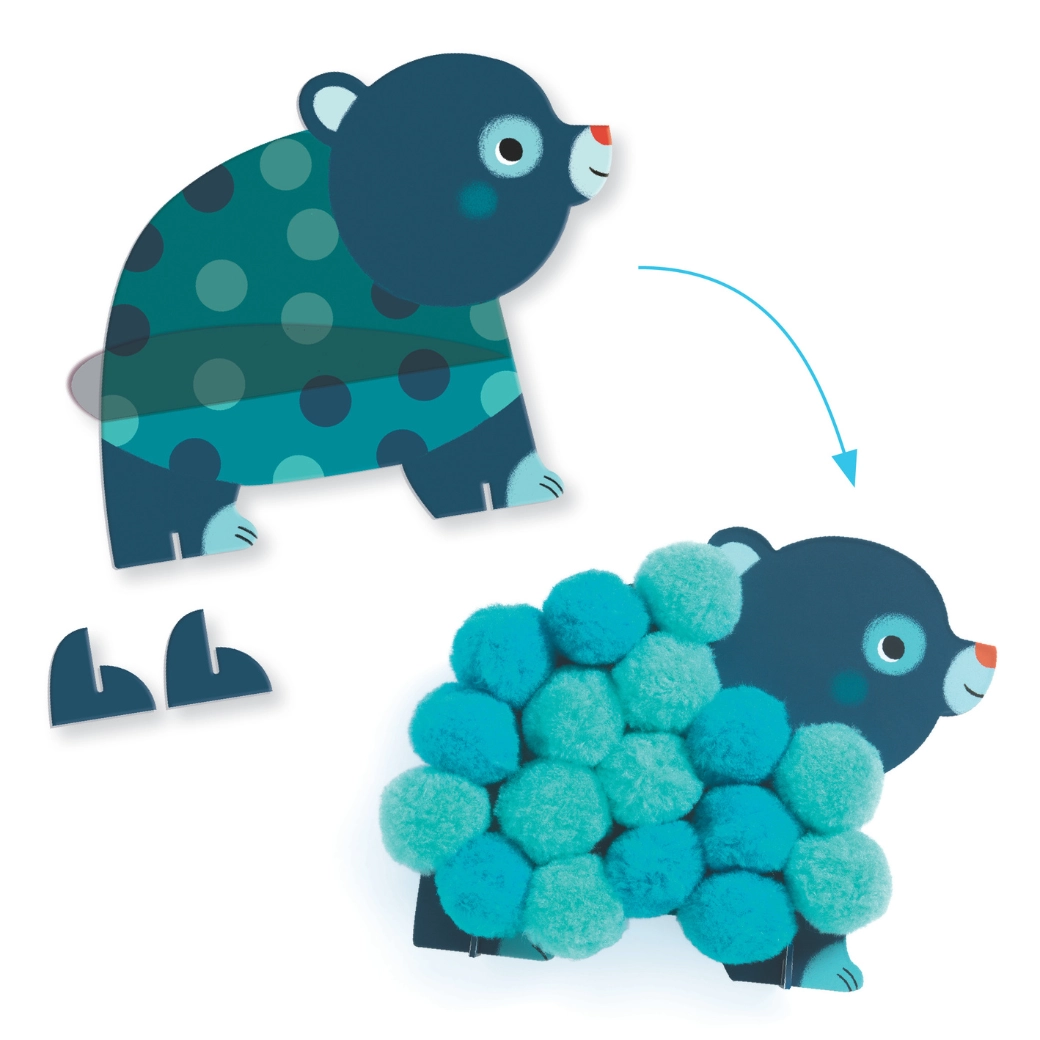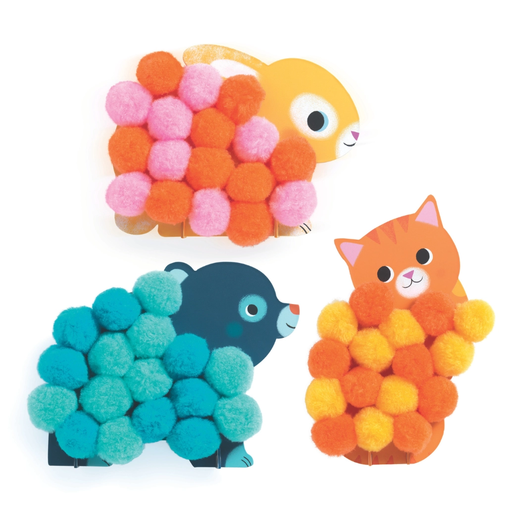 Ta očarljiv ustvarjalni komplet znamke Djeco otrokom prinaša prvo veselje do ustvarjanja. Iz barvitih, ilustriranih podlag v obliki živalic otroci dodajajo mehke cofke in tako ustvarijo prijetno teksturiran kožušček zajčka, medvedka ali mucke. Deli so veliki in dobro sedejo v roke, zato so idealni za majhne dlani.