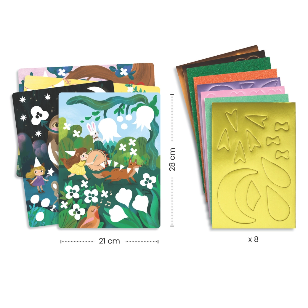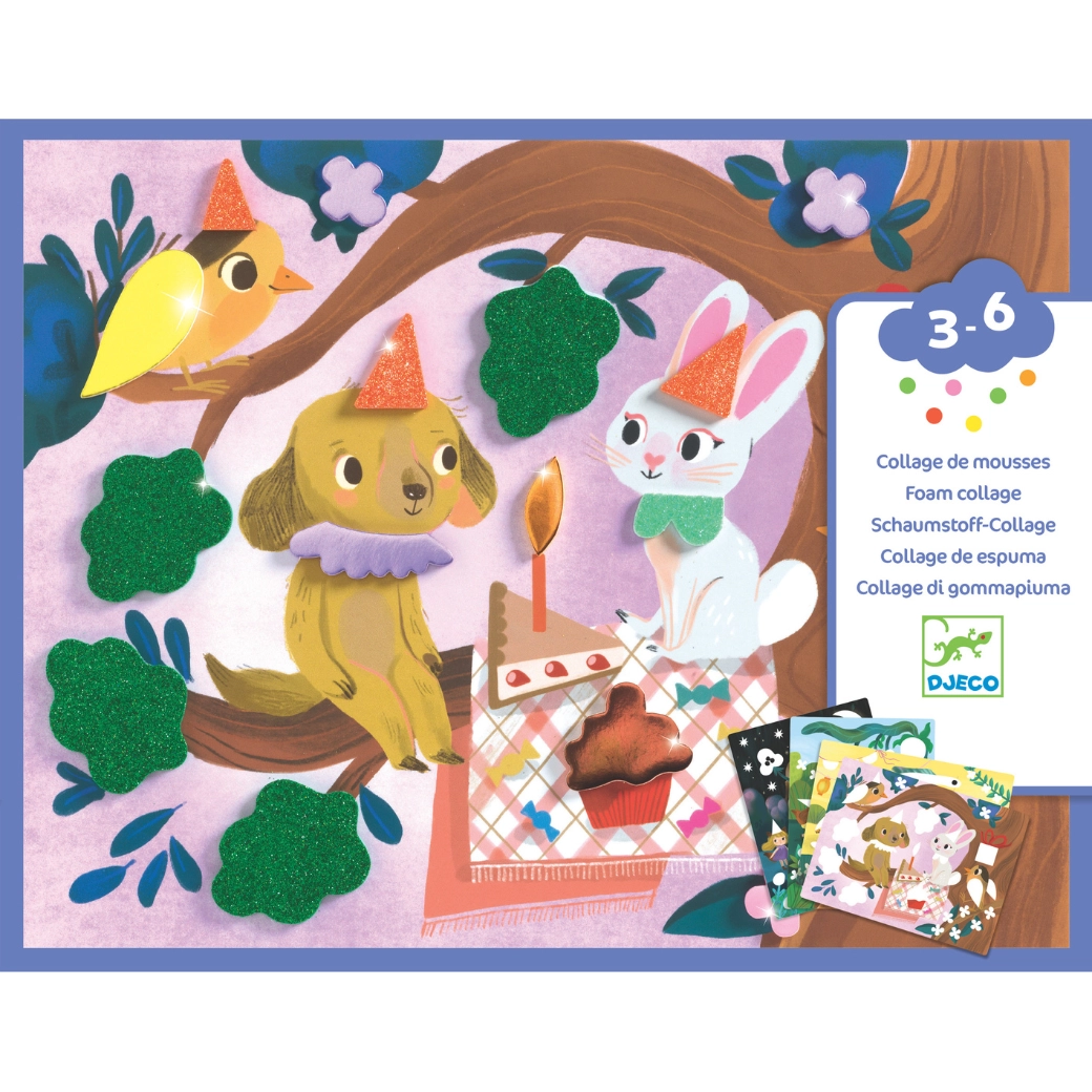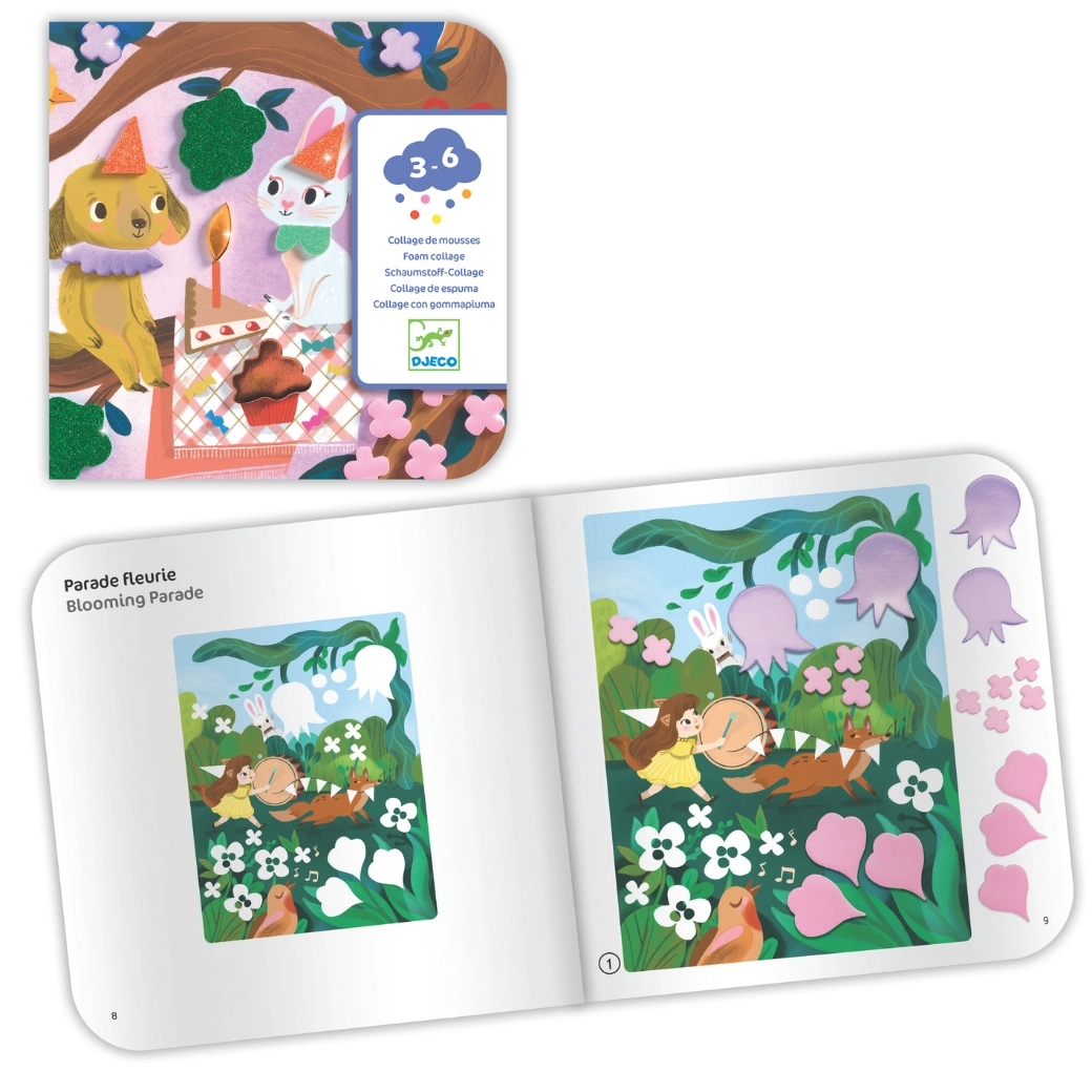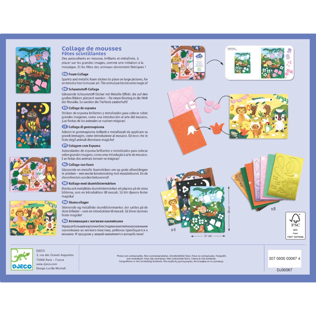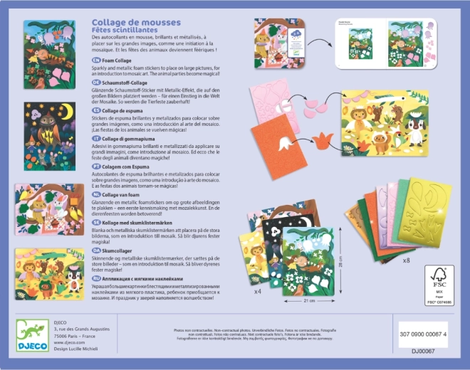 Ta izvirna penasta kolaža »Bleščeče zabave« prinaša otrokom veselje do ustvarjanja brez nereda. Predtiskane kartonske podlage s prikupnimi živalmi se dopolnjujejo z barvnimi, pogosto bleščečimi, penastimi oblikami. Otroci preprosto odlepijo predizrezane koščke in jih prilepijo po navodilih ali lastni domišljiji.