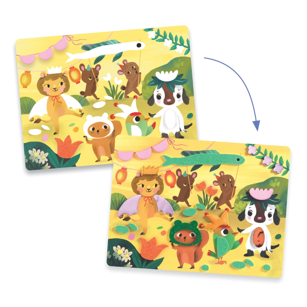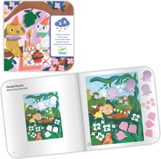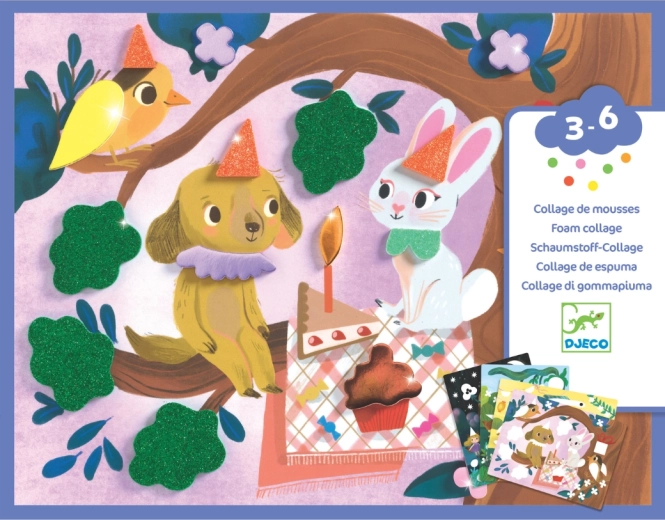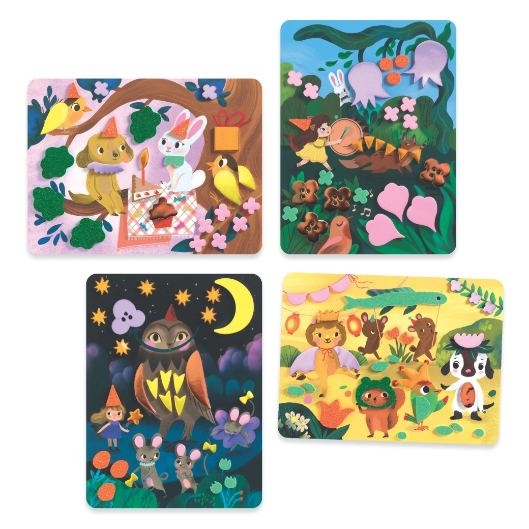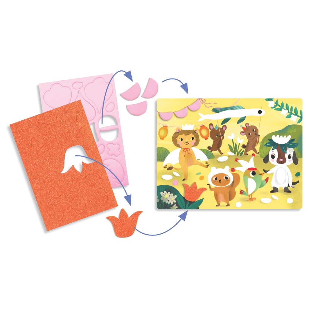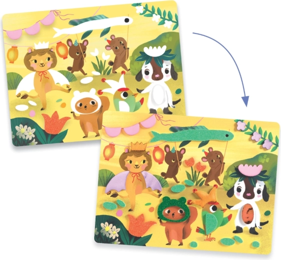 Z lepilnimi penastimi oblikami z bleščečo površino otroci zlahka ustvarijo žive, sijoče motive z živalmi na zabavi. Brez nereda – samo odlepiti in prilepiti.