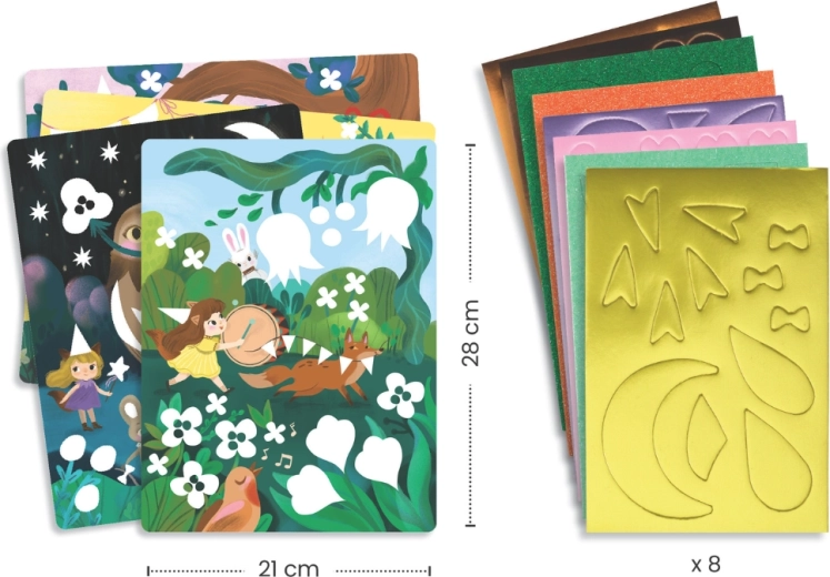 - Ilustrirane kartonske podlage, lepilni penasti koščki (vključno z bleščečimi), navodila