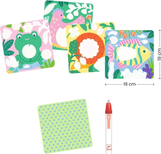 Vodne pobarvanke Djeco otrokom prinašajo čarobno izkušnjo: na prvi pogled preproste slike se ob stiku z vodo spremenijo v barvito prizorišče, polno živalskih prijateljev. Ko se kartice posušijo, barve izginejo in zabava se lahko začne znova.