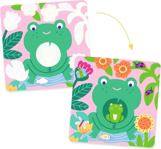 Komplet vsebuje kvadratne, trpežne kartice z ilustracijami žabice, ribice, polžka, ptička in drugih vrtnih živalic ter polnilno vodno pero. Dejavnost je varna, brez barvil in primerna za dom in potovanja.