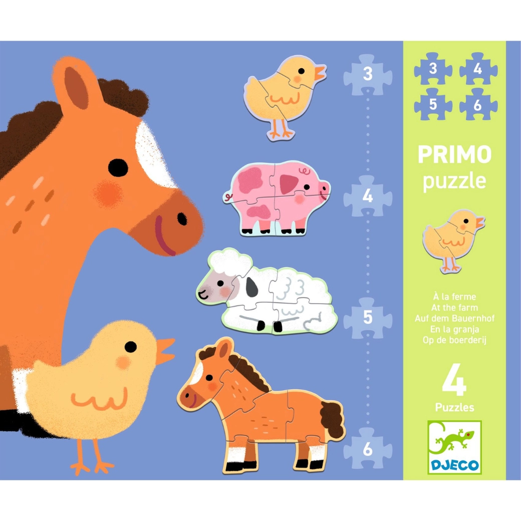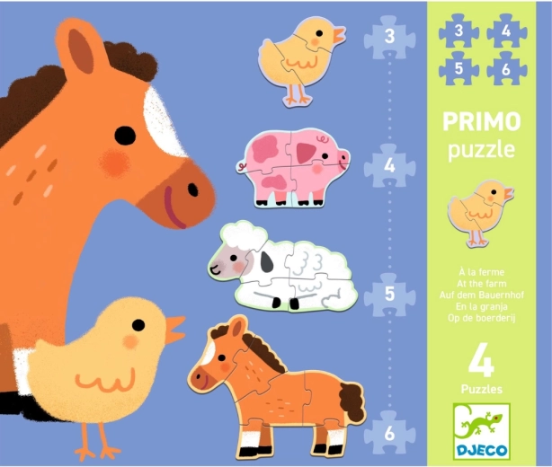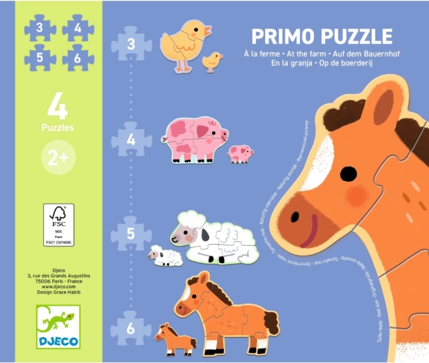 Prvo sestavljanje za najmlajše z motivom podeželja: Djeco Puzzle Primo Na kmetiji razvija fino motoriko, logično mišljenje in vizualno zaznavanje s pomočjo ljubkih živali s kmetije.