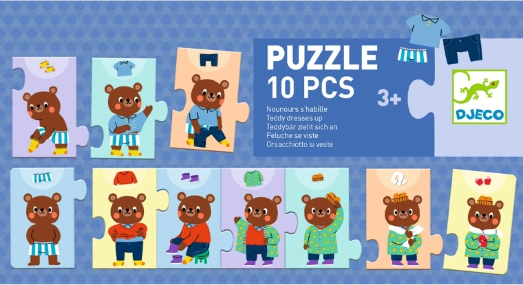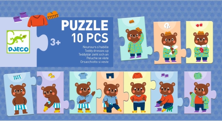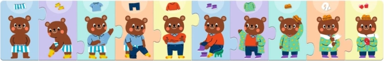 Zabavna otroška sestavljanka, v kateri otroci razvrščajo, kako se medvedek postopoma oblači. Idealna za razvoj fine motorike, logičnega razmišljanja in razumevanja zaporedja korakov. Vsebuje 10 trdnih kosov, kakovosten karton in ilustracije, ki otroke navdušujejo.