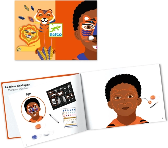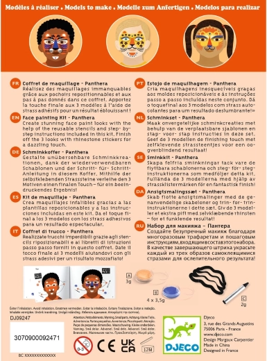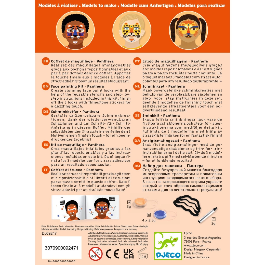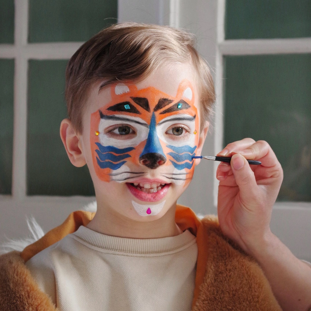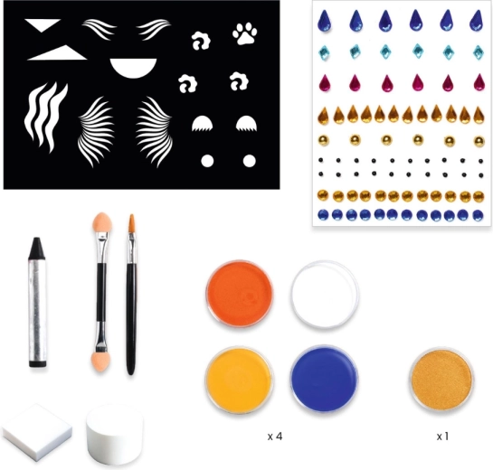 Ta ustvarjalni komplet za ličenje ponuja vse, kar potrebujete za ustvarjanje prepričljivih živalskih motivov. Zahvaljujoč skrbno izbranim barvam – oranžni, beli, rumeni, modri in zlati – zlahka ustvarite efektne črte, pikice in bleščeče detajle. Priložene šablone in samolepilni kamenčki dodajo make-upu profesionalen videz.