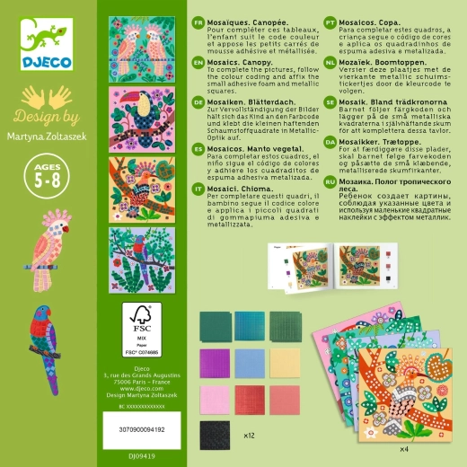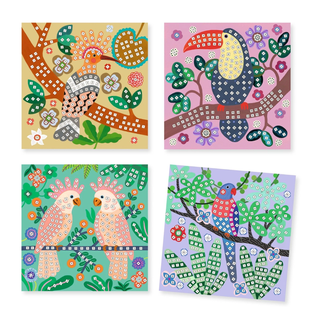 Ta ustvarjalni komplet znamke Djeco prinaša prve korake v svet mozaikov. Otroci po številčnih in barvnih simbolih lepijo majhne samolepilne ploščice na predtiskane kartonske podlage in postopoma razkrivajo pisane prizore s ptički na veji. Končane slike se čudovito podajo v otroško sobo in otroci so lahko nanje upravičeno ponosni.