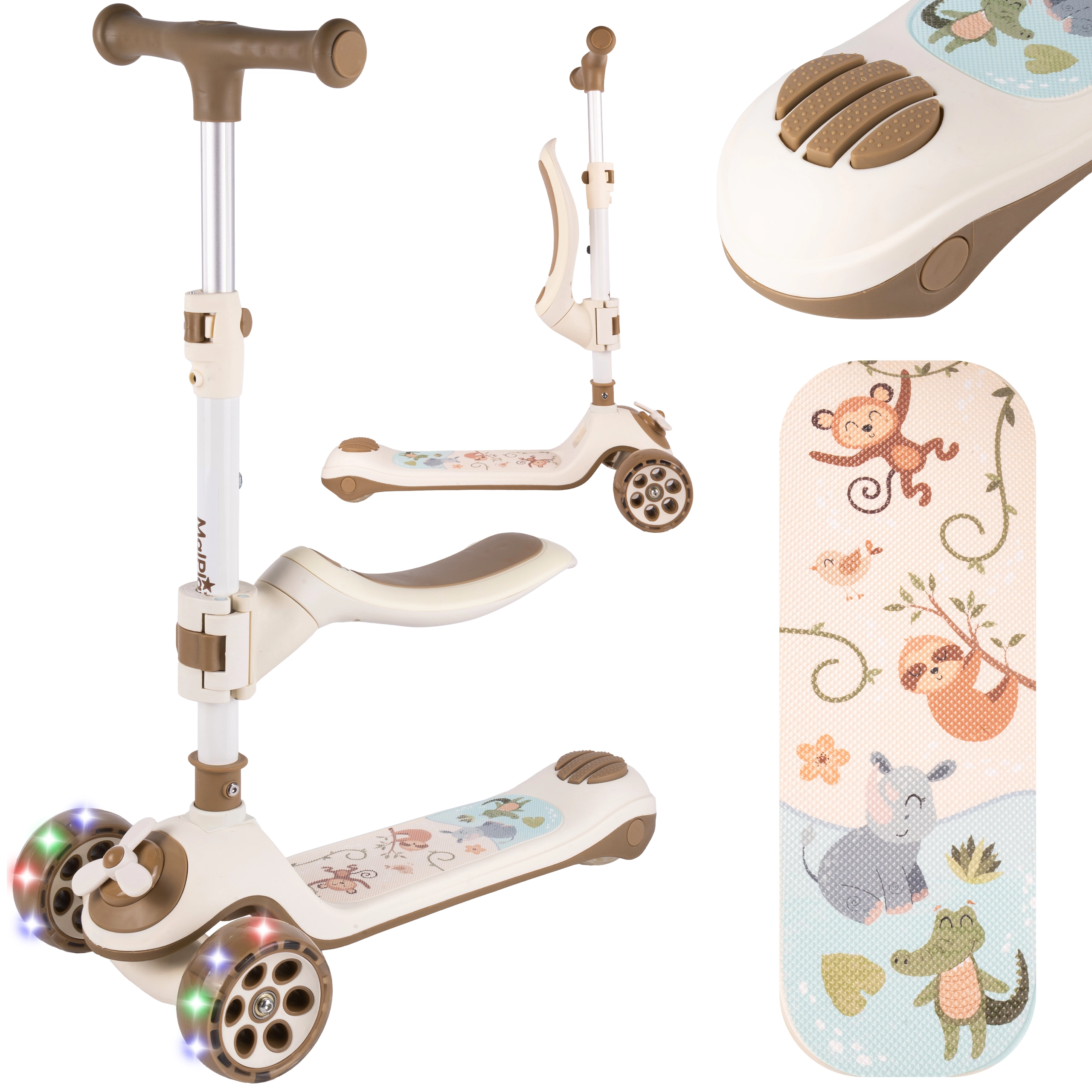 Lahek otroški skiro s sedežem v elegantni bež barvi ponuja udobno vožnjo in odlično stabilnost. Sprednja in zadnja kolesa imajo LED osvetlitev, ki navduši otroke in poveča vidnost. Konstrukcija iz aluminija in jekla je trpežna, ročaji iz TPR prijetno sedejo v roko, tiha PU kolesa pa zagotavljajo gladko vožnjo po različnih podlagah.