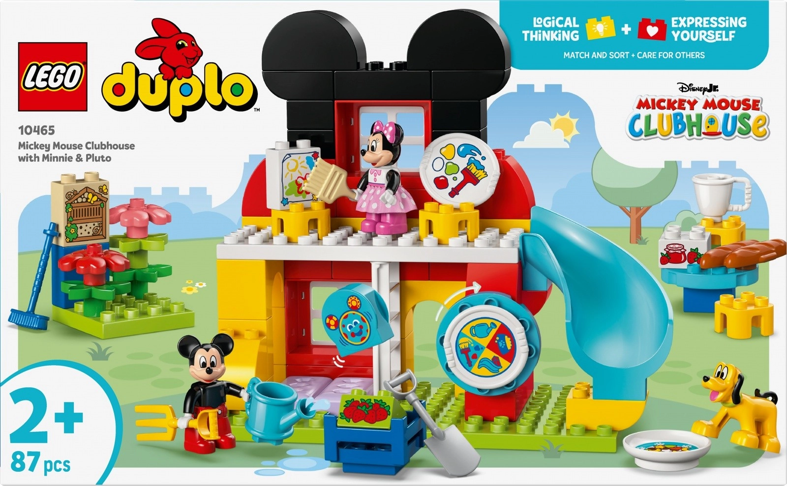 Komplet ponuja vse za bogato igro: dvonadstropni klub z velikimi, malčkom prijaznimi kockami, toboganom, ateljejem, vrtičkom z hiško za žuželke, mizicami in stoli ter posebnimi vrati za Pluta. Vključene so figurice MICKEY, MINNIE in PLUTO ter potiskan element z računalnikom, ki podpira pripovedovanje zgodb in igro vlog.