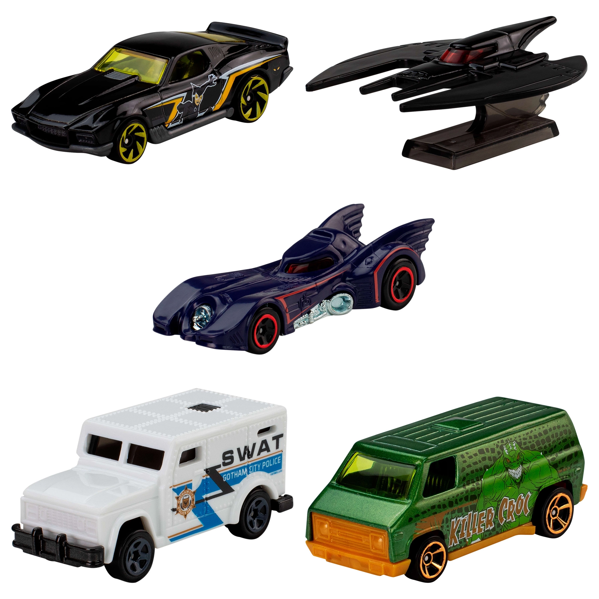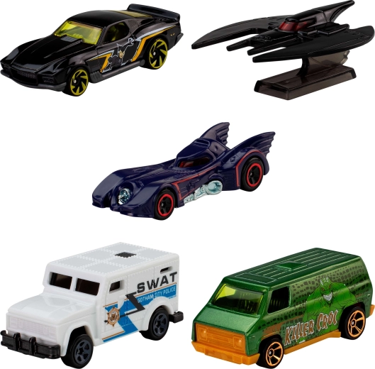 Pet podrobno izdelanih kovinskih modelov v merilu 1:64 zajema junake in zlikovce iz Gothama – idealno za oboževalce DC in Hot Wheels.