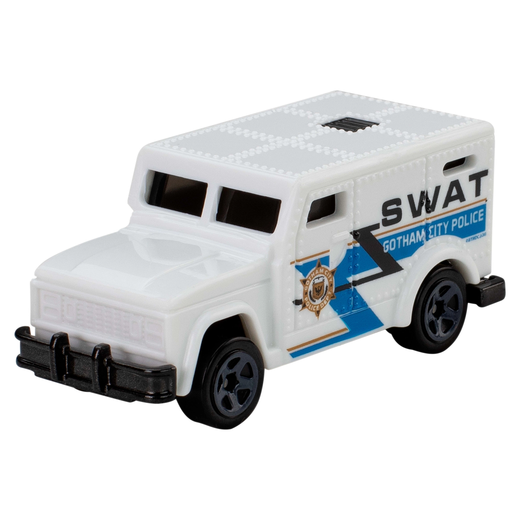 V pakiranju najdete na primer BATMOBIL, policijsko vozilo SWAT mesta Gotham City ter tematske avtomobile zlikovcev – popolni za igralne prizore in za na polico.