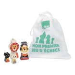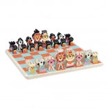 Šahovske figure so ilustrirane kot različne živali, kar naredi igro zanimivo in privlačno za majhne otroke.