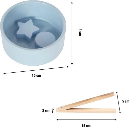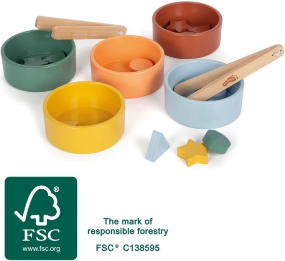 Ta izobraževalni komplet združuje naravno radovednost otrok z načeli Montessori. Lesene skodelice in liki v intenzivnih barvah vabijo k svobodni igri, razvrščanju in prenašanju s pomočjo lesenih pincet. Otroci razvijajo prijem, natančnost in zbranost ter se obenem učijo prepoznavanja oblik in barv.