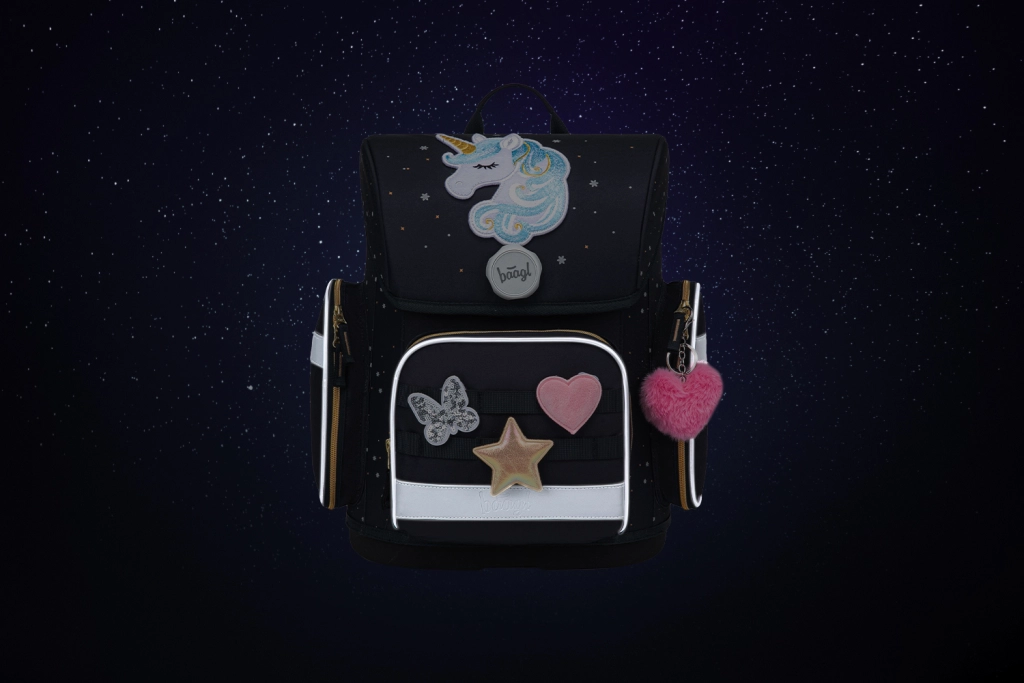 Šolski komplet BAAGL Ergo Unicorn Gold je zasnovan za otroke od 1. razreda OŠ. Aktovka z ERGO Adjustable System raste z otrokom, ima trdno dno, vodoodporen material in odsevne elemente za varnost. Intuitivna Fidlock ključavnica olajša odpiranje, sprednji žep je izoliran, stranska žepa pa sprejmeta steklenico za pijačo. V notranjosti je pregleden organizator z urnikom in zateznim trakom za težje učbenike.
