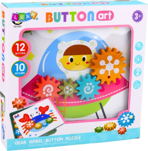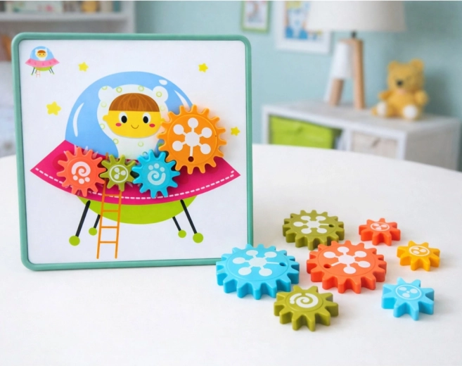 Ta pametna sestavljanka povezuje igro in učenje. Otroci nameščajo barvne zobnike v izreze na tematskih kartah in opazujejo, kako se ob pravilnem povezovanju vsi zobniki vrtijo skupaj. Na preprost in nazoren način tako razumejo osnove prenosov in princip sodelovanja posameznih elementov.