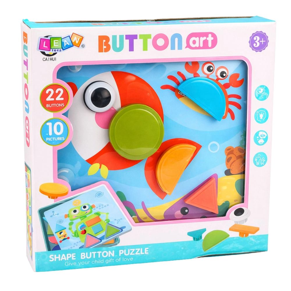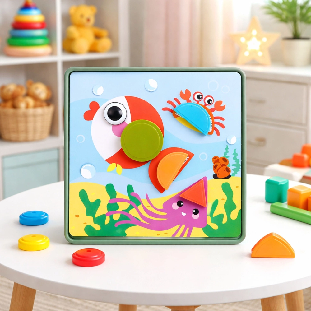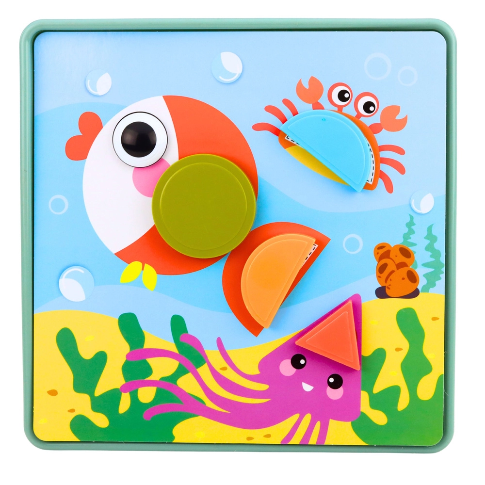 Ta izobraževalna mozaika prinaša igriv način učenja – otroci pripenjajo geometrijske koščke na slikovne kartice ali pa si oblikujejo lastne kompozicije. Deli so prijetni za prijem in varni za majhne roke, zato so odlični za vadbo natančnosti gibov in osredotočenosti.