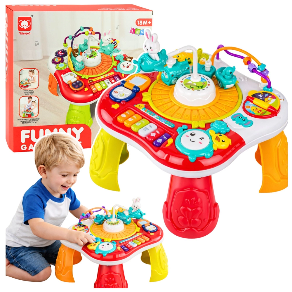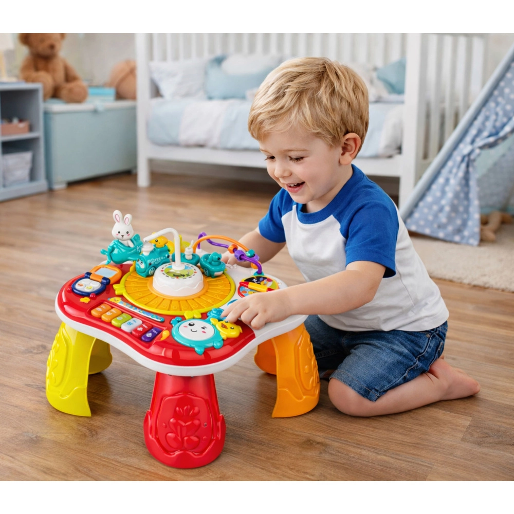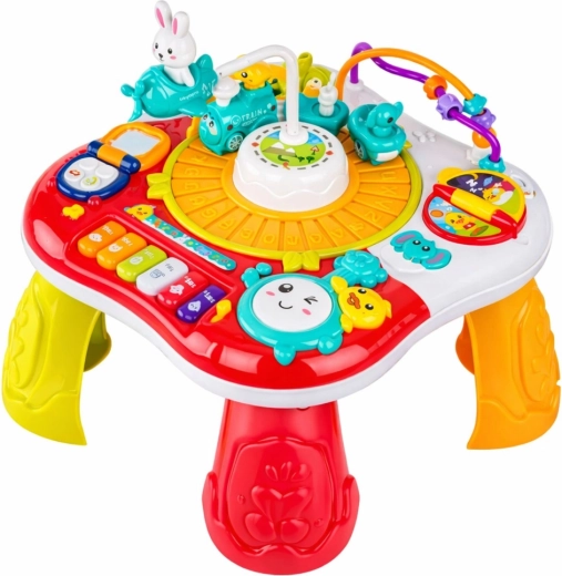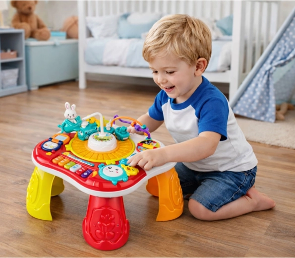 Izobraževalna mizica 2-v-1 podpira naravno učenje skozi igro: otroci odkrivajo barve, oblike in zvoke, vadijo fino motoriko in koordinacijo oko–roka. Središče zabave je premikajoči se zajček, ki se premika gor in dol, medtem ko klavirček predvaja vesele melodije, boben pa oddaja zabavne zvoke. Realistične funkcije telefona in gumbov spodbujajo domišljijo ter samostojno raziskovanje.