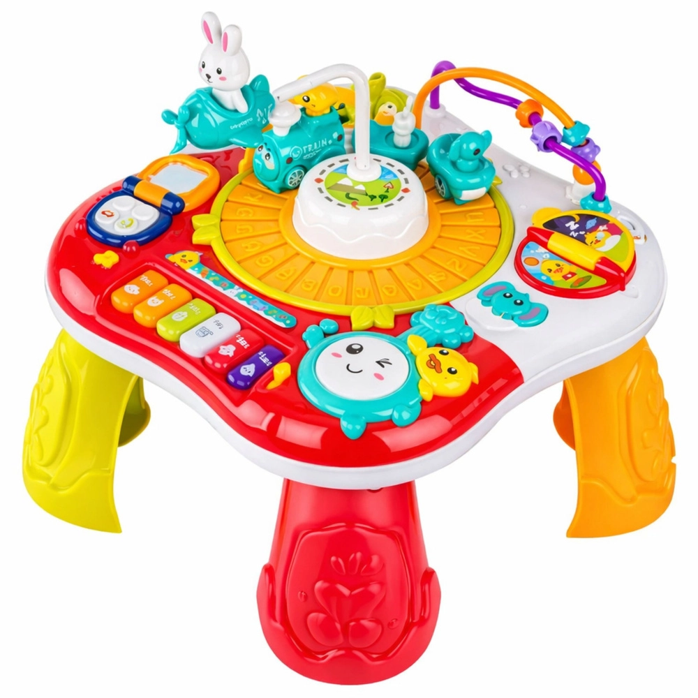 Interaktivna izobraževalna mizica 2-v-1 je odlična izbira za razvoj čutov in spretnosti otrok. Ponuja klavirček z melodijami, svetlobne in zvočne učinke, imitacijo telefona, vrteča kolesca in zobnike ter premikajočega se zajčka, ki pritegne pozornost. Zahvaljujoč snemljivim nogam jo zlahka spremenite v ploščato izobraževalno ploščo – idealno za različne starostne faze.