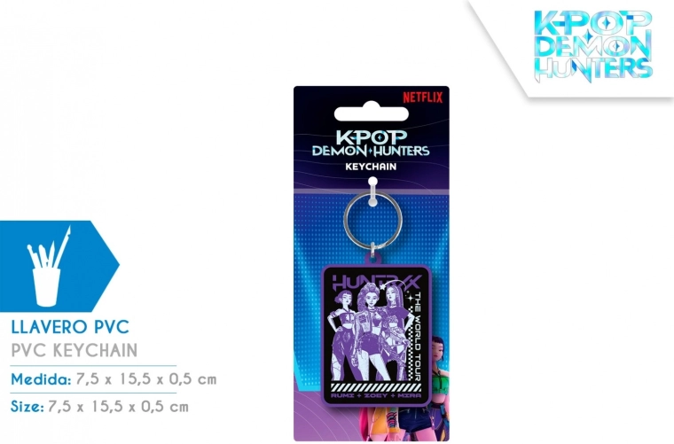 Dodajte svojemu vsakdanu pridih fandoma z obeskom za ključe K-POP DEMON HUNTERS Huntrix. Kombinacija kakovostnega PVC in kovinskih elementov zagotavlja dolgo življenjsko dobo in varno pritrditev na vaše predmete.