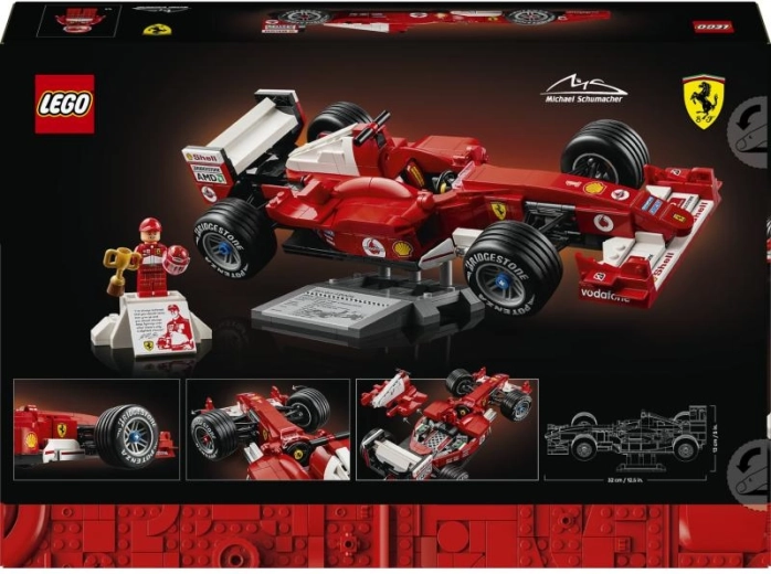 Proslavite zlato ero F1 z ekskluzivnim setom LEGO Icons Ferrari F2004 in minifigurico Michaela Schumacherja. Podroben model legendarnega enoslednika ponuja delujoče krmiljenje, realističen kokpit, vzdolžno nameščen V10 motor in zaviralne pnevmatike Bridgestone Potenza. V kompletu so razstavno stojalo s statistikami, minifigurica s čelado in pokalom ter elegantno podium z natisom in citatom. Odlično darilo za navijače F1 in prefinjen kos za razstavo.