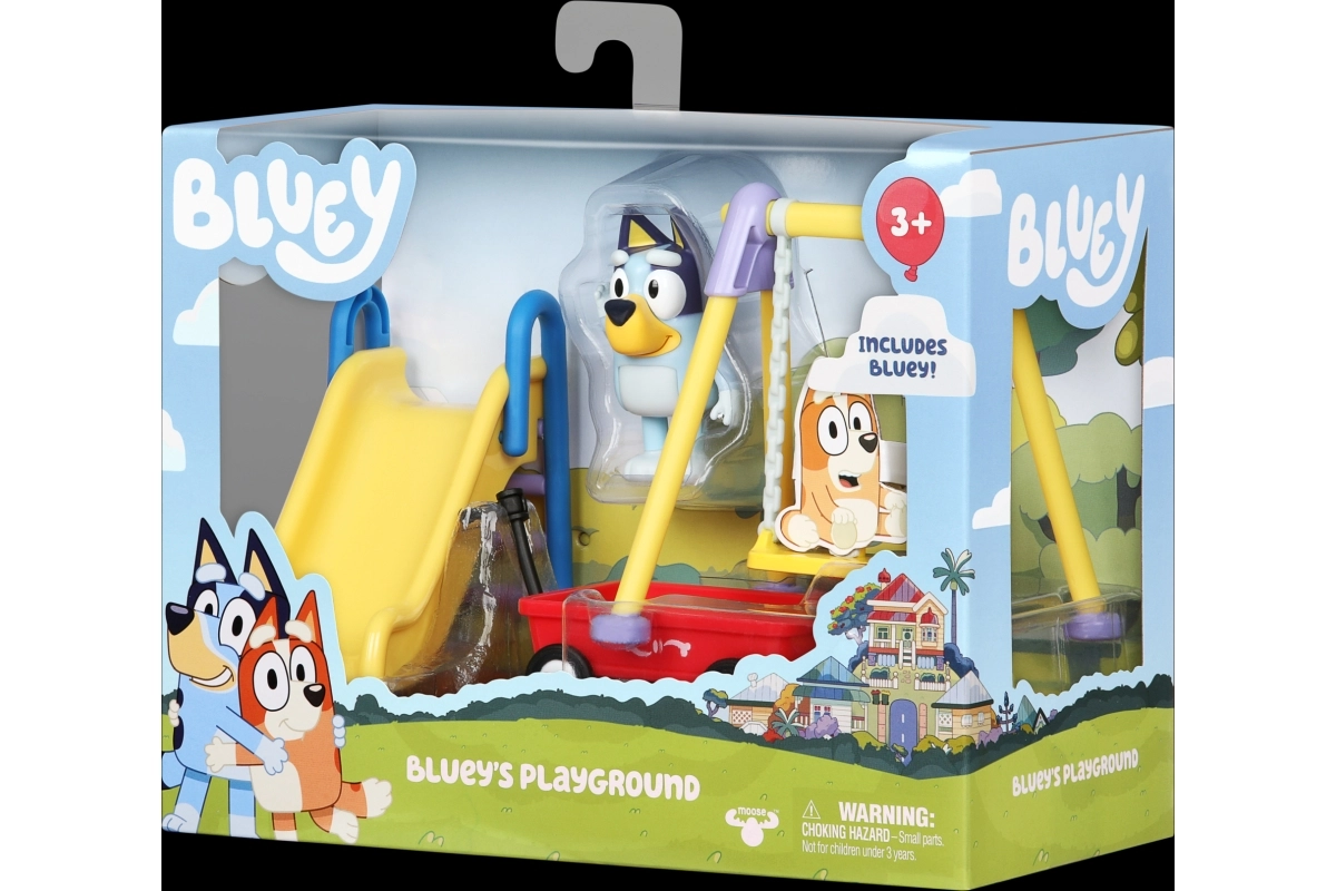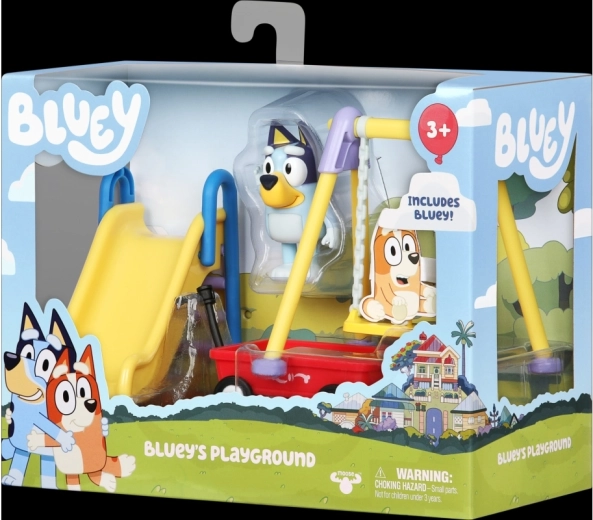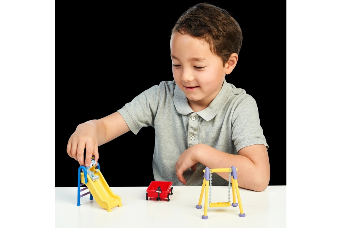 Odkrijte čar sveta BLUEY s kompaktno igralno škatlo za park. Čaka vas premična figurica Bluey, zabavni tobogan, gugalnica in voziček za neskončne zgodbe in domišljijo otrok od 3. leta naprej.