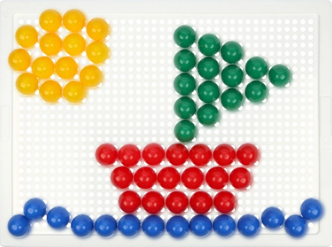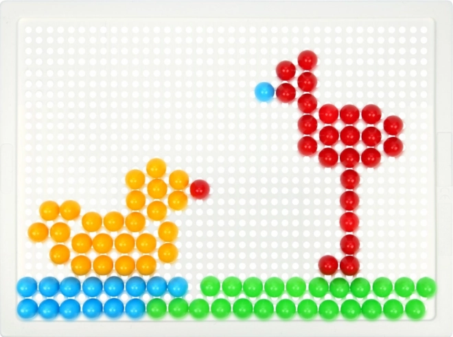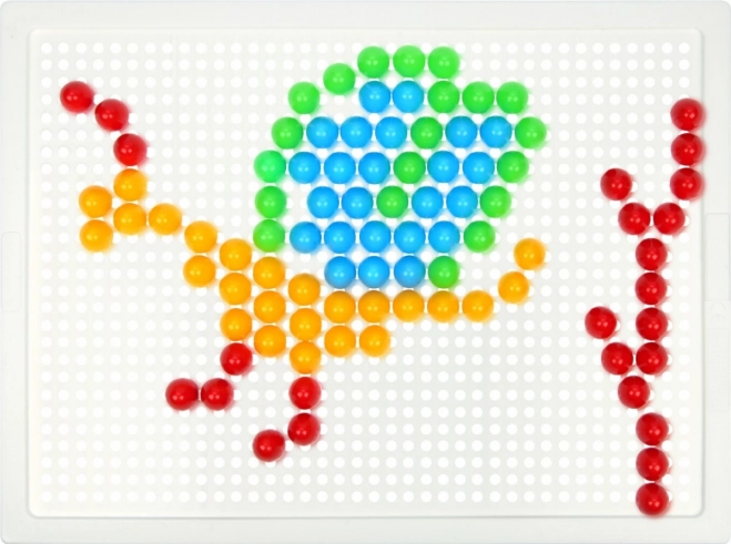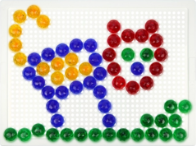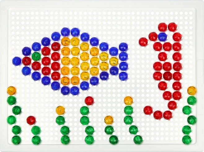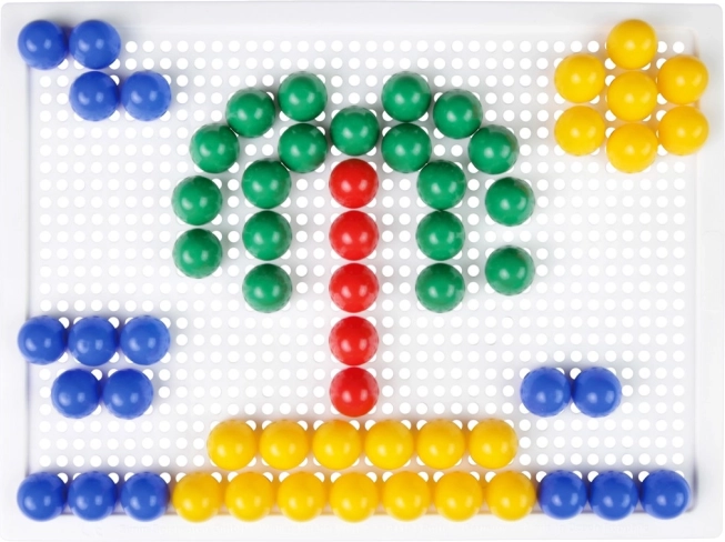Set vsebuje plastično mrežico 21 × 16 cm in 80 klobučkov s premerom 15 mm. Zaradi kompaktnih mer je idealna za dom in na potovanja. Mozaika ne vsebuje predlog – tako spodbuja prosto igro in domišljijo.