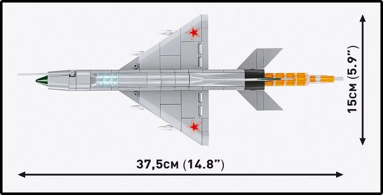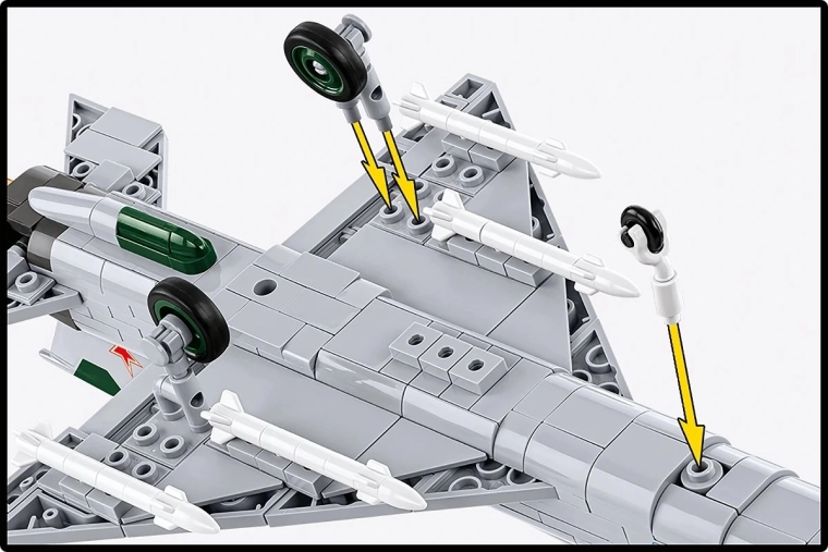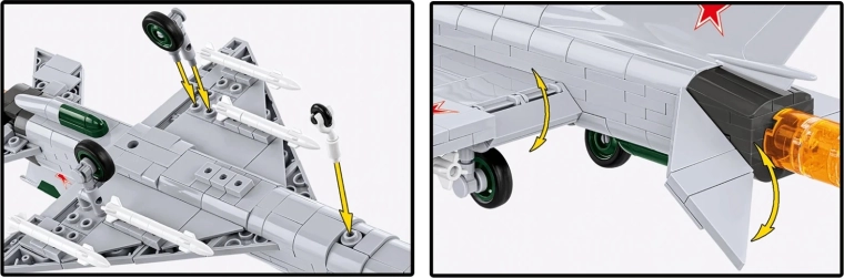 Legendarni lovec MiG‑21 MF – opora vojaškega letalstva v številnih državah – zdaj kot kakovosten gradbeni komplet za zahtevne in začetne graditelje. Čakajo vas trpežni potiski neposredno na kockah (brez nalepk), verni detajli kabine in podvozja ter značilni zeleni vstopni stožec. Priložene so tudi replike izstrelkov R‑13S ter učinkovita imitacija plamena reaktivnega motorja.