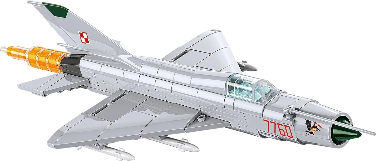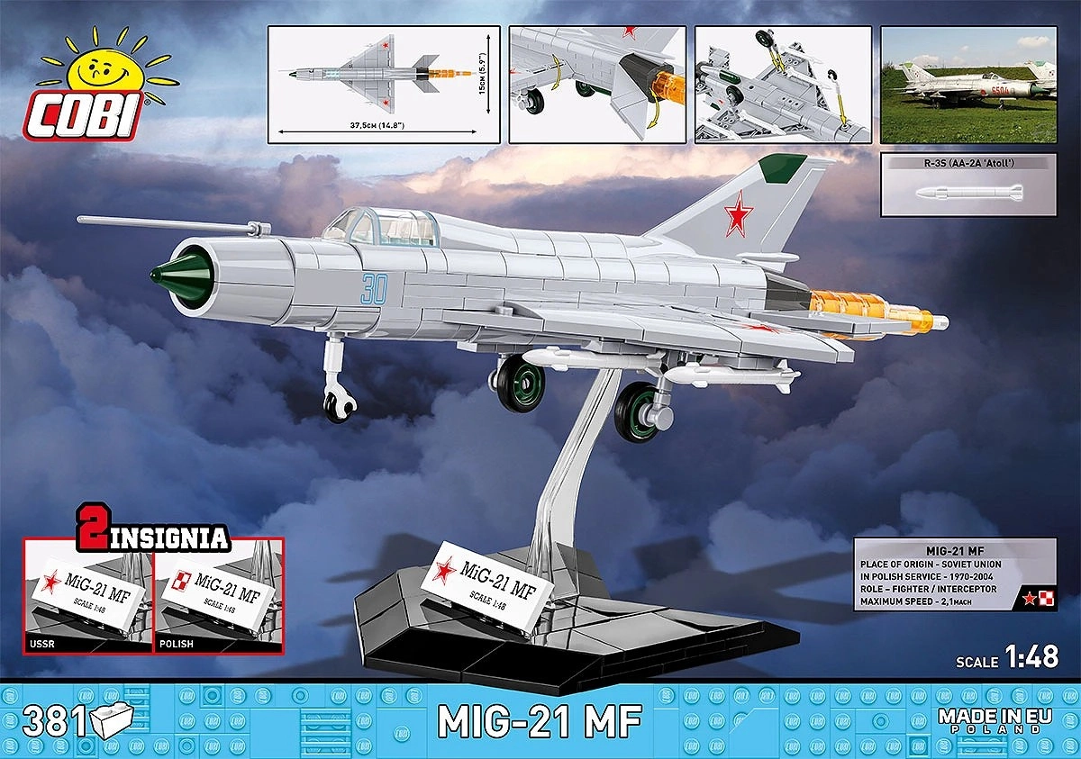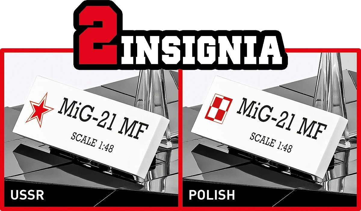 Verni oblikovni detajli MiG‑21 MF, poljske in sovjetske oznake ter enotna značka so neposredno natisnjeni na kockah za čist, zbirateljski videz brez mehurčkov.