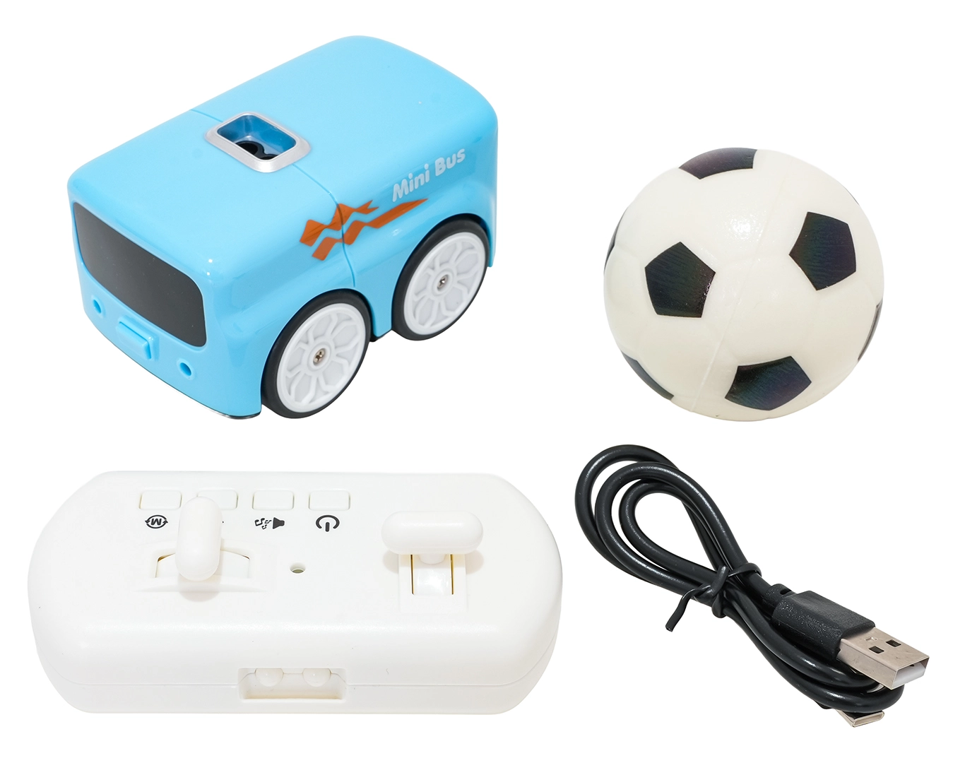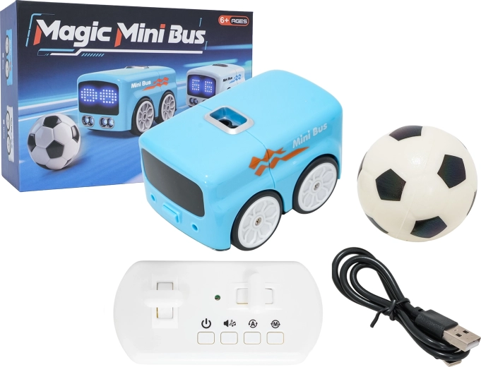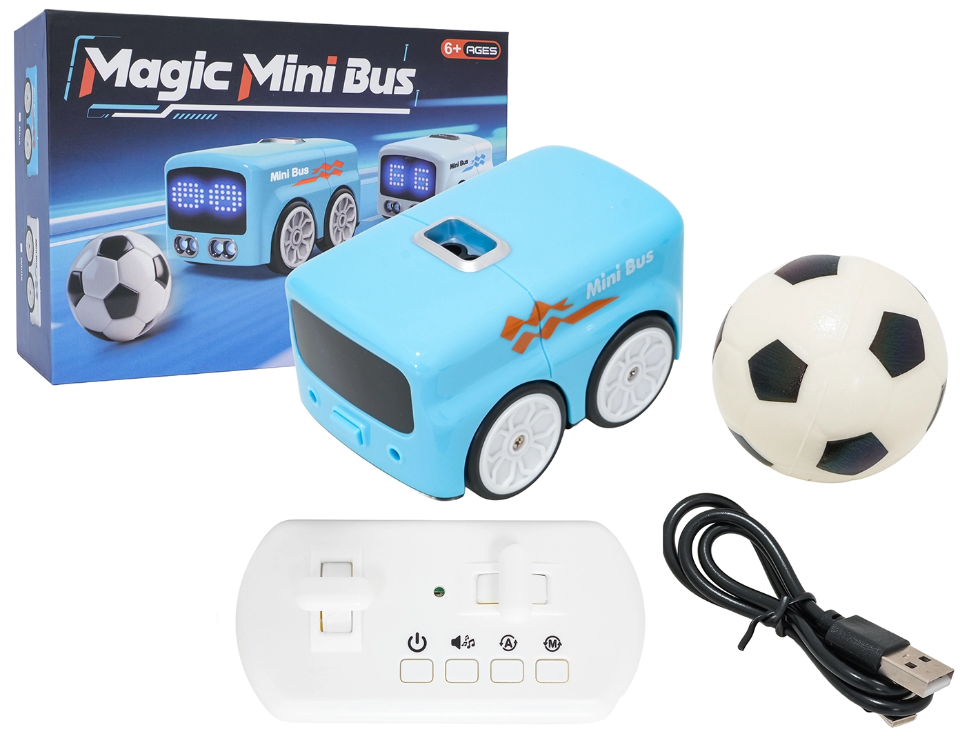Igra ponuja veliko načinov: daljinsko upravljana vožnja, sledenje žogici, beg/sledenje roki, sledenje črti in demo način, ki pokaže vse veščine. Avtobus se vrti za 360°, ima zadnje luči in vesele zvočne učinke. Polni se prek USB‑C in je dobavljen z vgrajeno baterijo 3,7 V; upravljalnik potrebuje 2× AAA (nista priloženi).